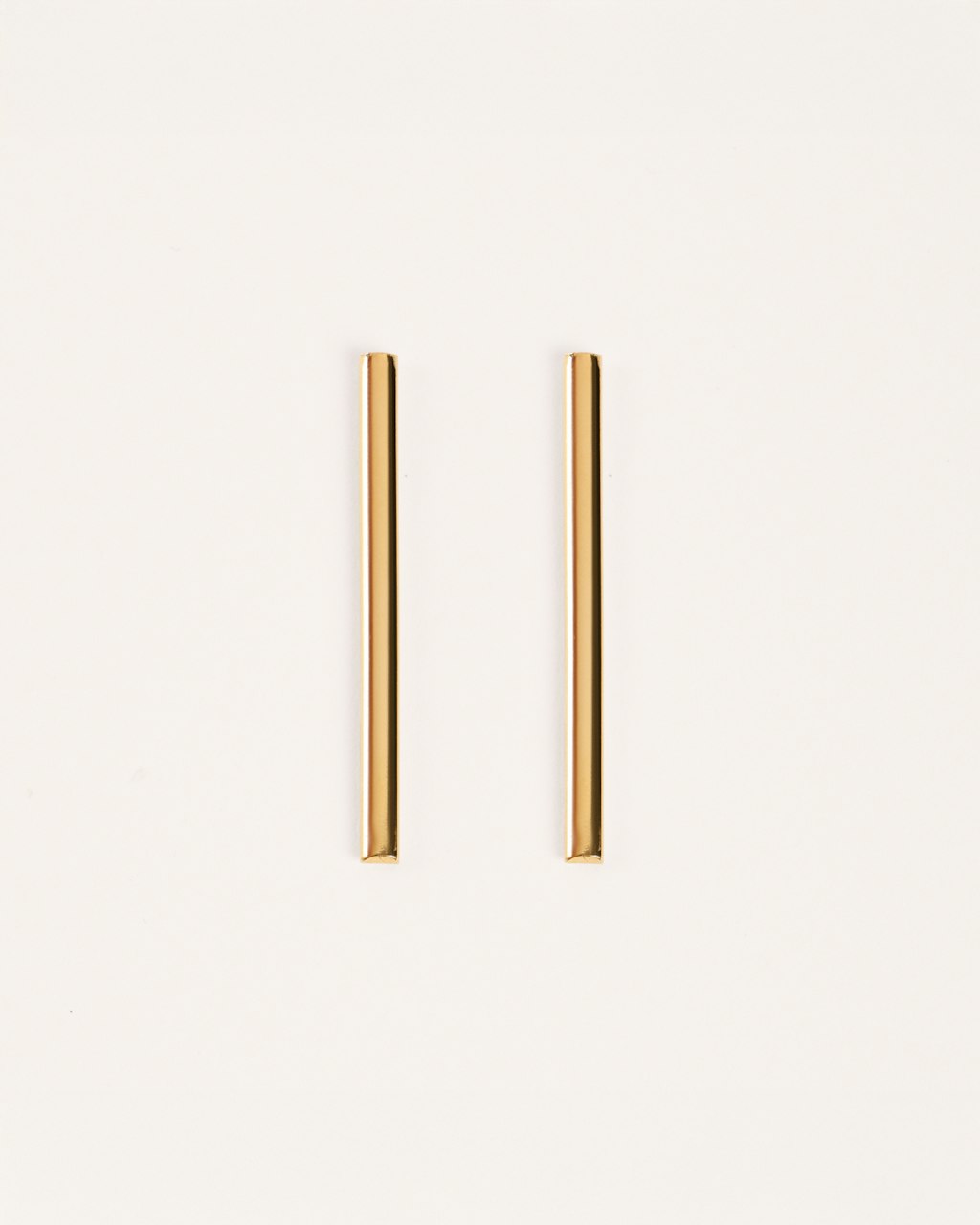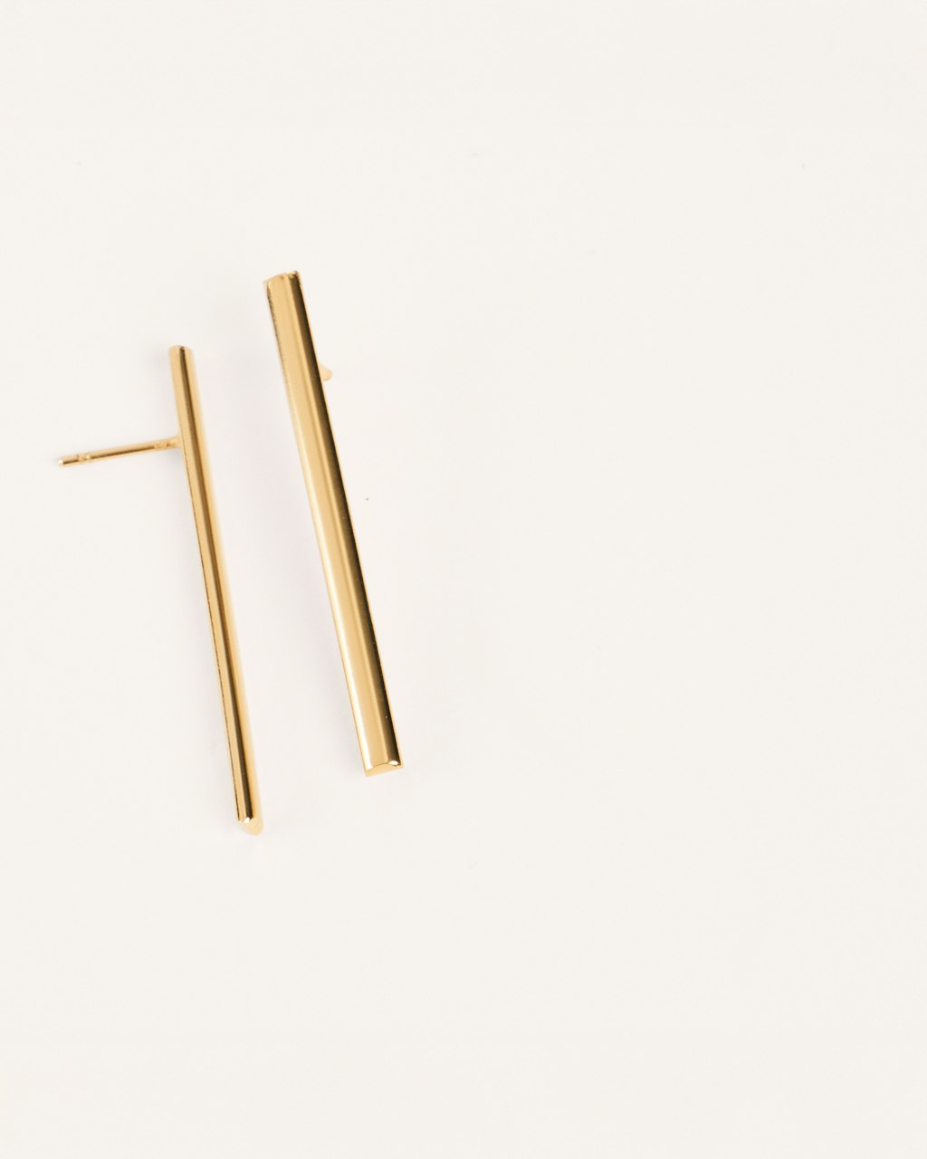 Long rectangular bar shaped earrings. Made of brass and plated with 3 microns of 18 kt gold and nickel-free.