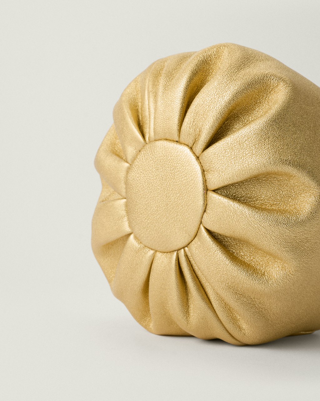Small vintage-inspired gathered clutch bag crafted from soft lambskin leather with a metallic gold finish. Features a top handle that adds a festive touch, a removable gold-plated chain strap, and a hidden magnetic closure.