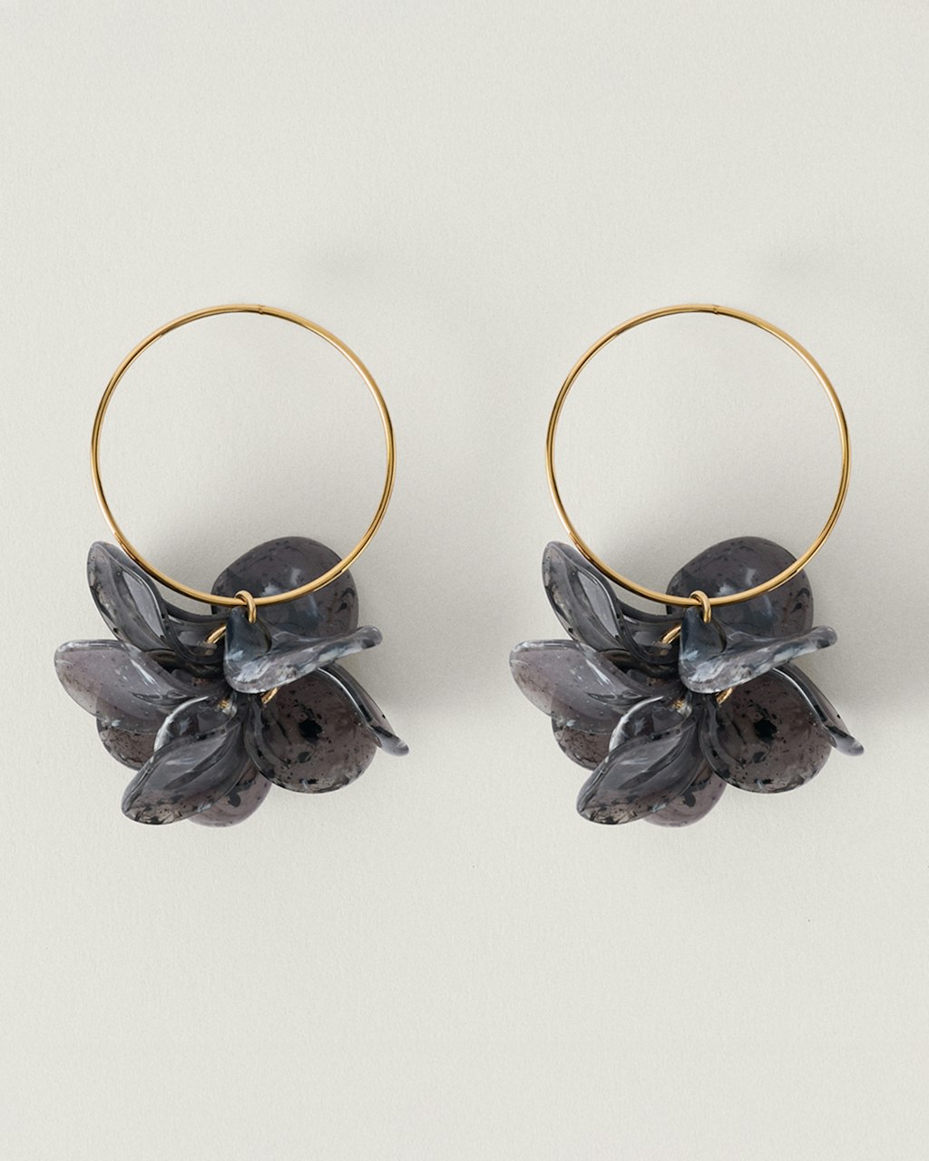 Methacrylate petal motifs very light Brass hanging on gold plated brass large hoop. Hoop with clousure.