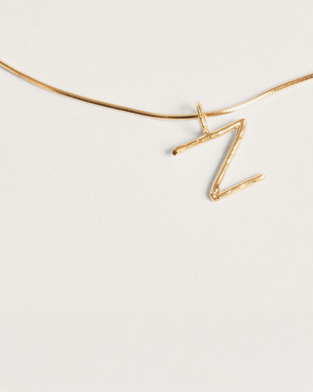 Colgante de plata de ley 925 chapada en oro de 24kt de la letra del abecedario que tú elijas en cadena de plata de ley con un chapado de 3µ (Plaqué d’or) en oro de 18kt.