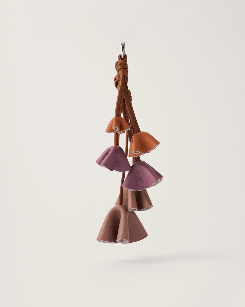 Llavero con detalle de flores en distintos tamaños y cordón en piel de vacuno, hecho a mano.