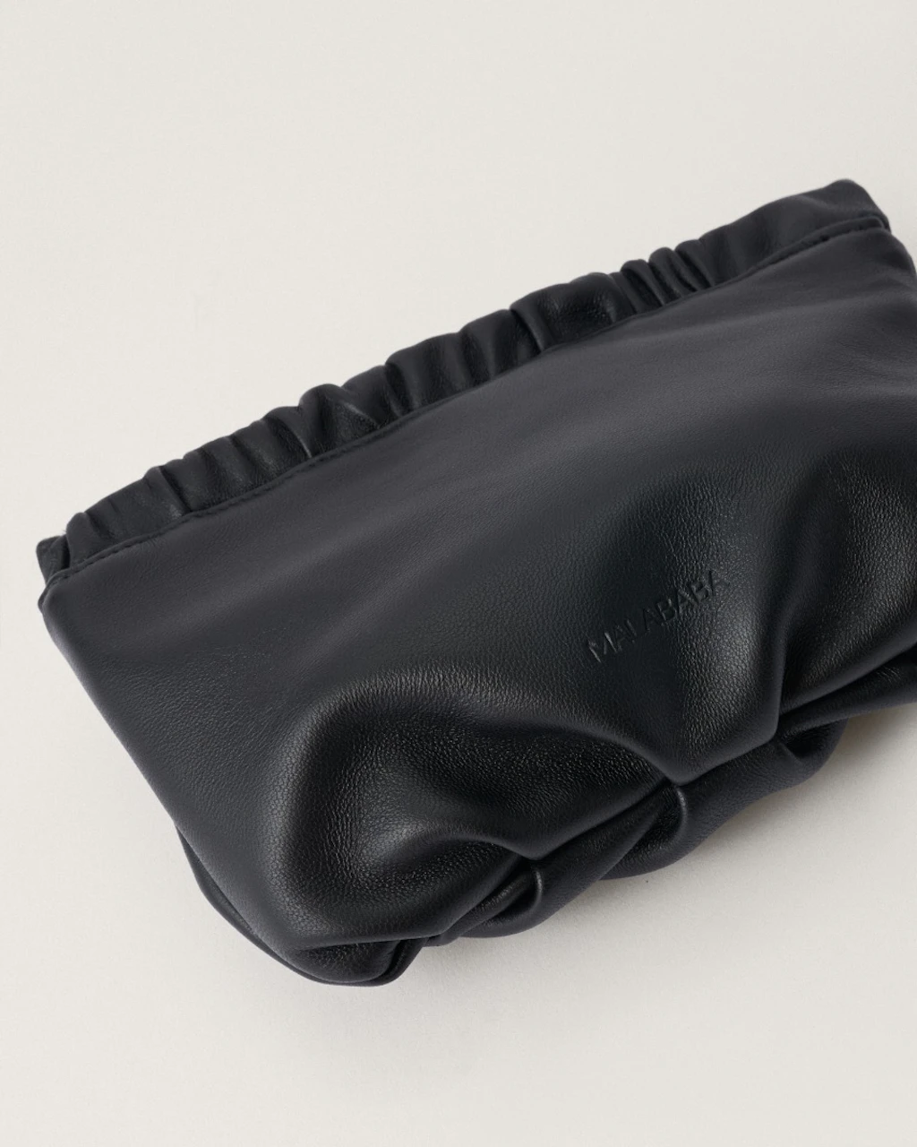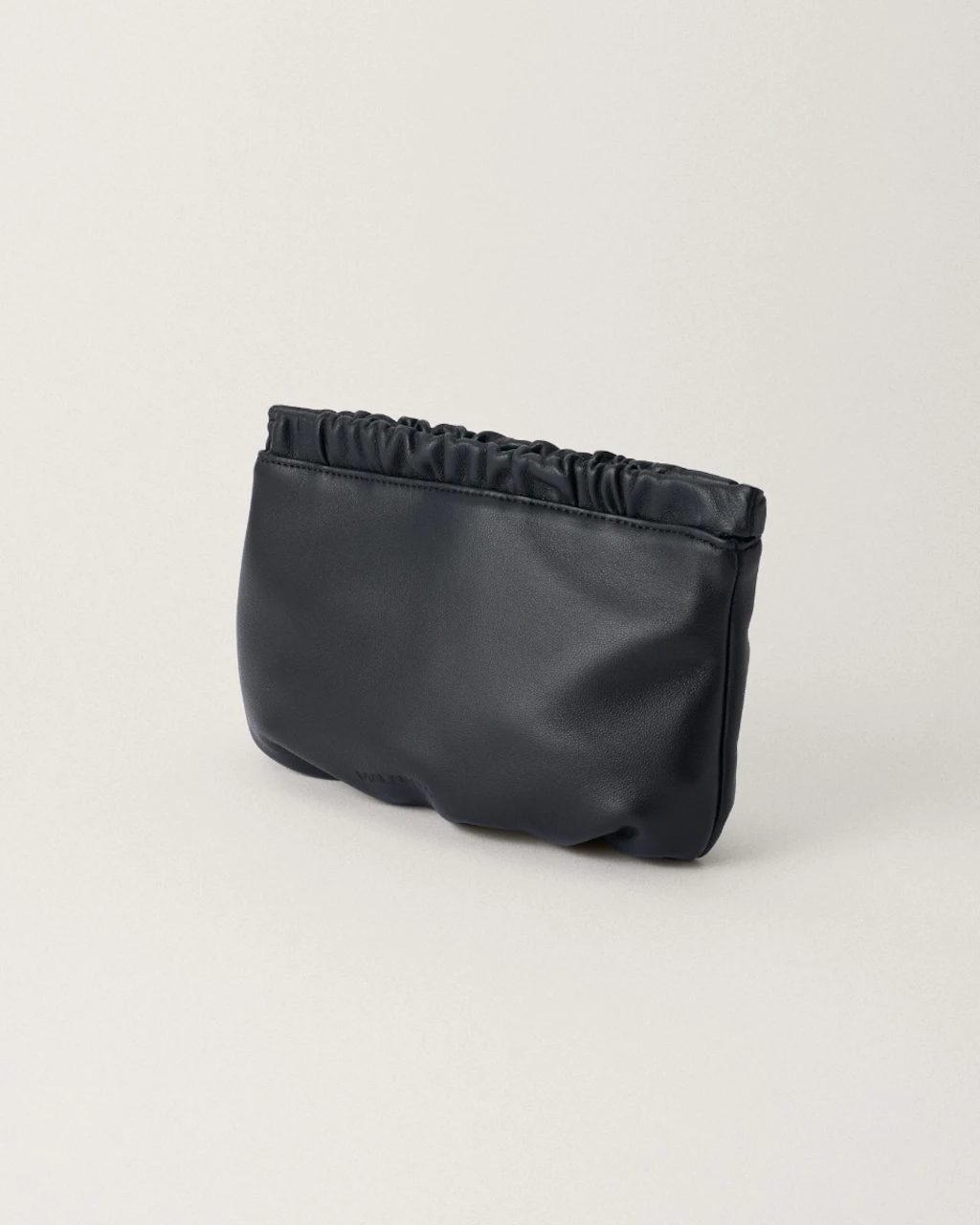 Bolso pequeño tipo estuche, con fruncidos. Hecho artesanalmente en piel de cordero extremadamente suave, y disponible en una gran variedad de colores. Pensado para llevar como bolso de mano tipo clutch.