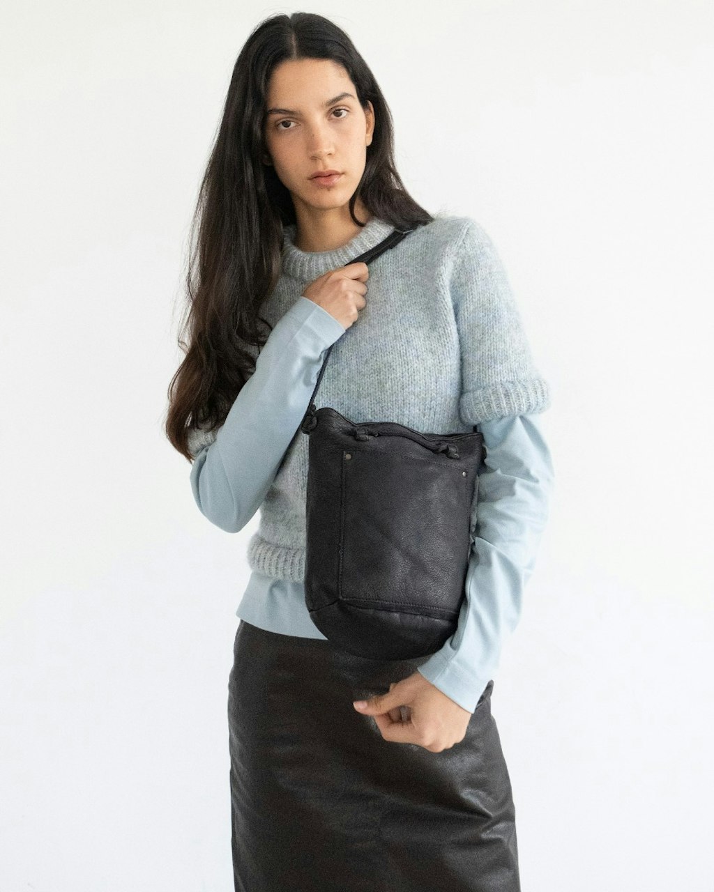 Bolso pequeño estilo bucket con bolsillo frontal, elegante y funcional. Su diseño espacioso lo hace perfecto para el día a día, con suficiente capacidad para tus esenciales