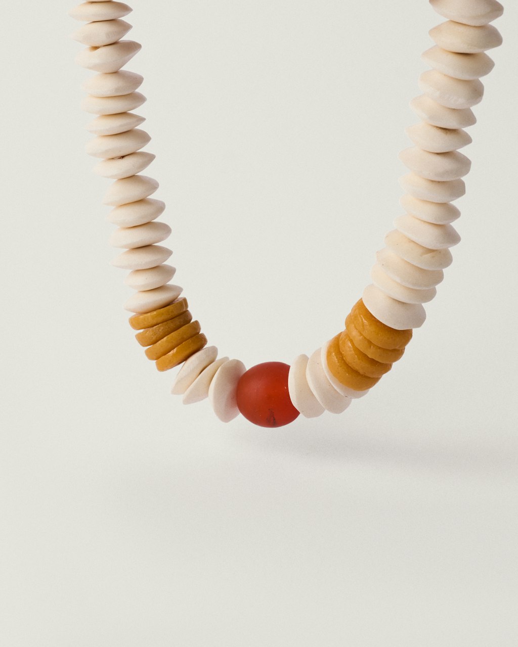 Collar elaborado con discos de hueso combinados con una bola central de vidrio, creando un diseño equilibrado que juega con texturas y materiales. La mezcla de piezas aporta carácter y singularidad, dando forma a un collar artesanal y atemporal, ideal para el día a día o para añadir un toque especial y diferente a cualquier look. Hecho a mano en nuestro taller de Madrid.