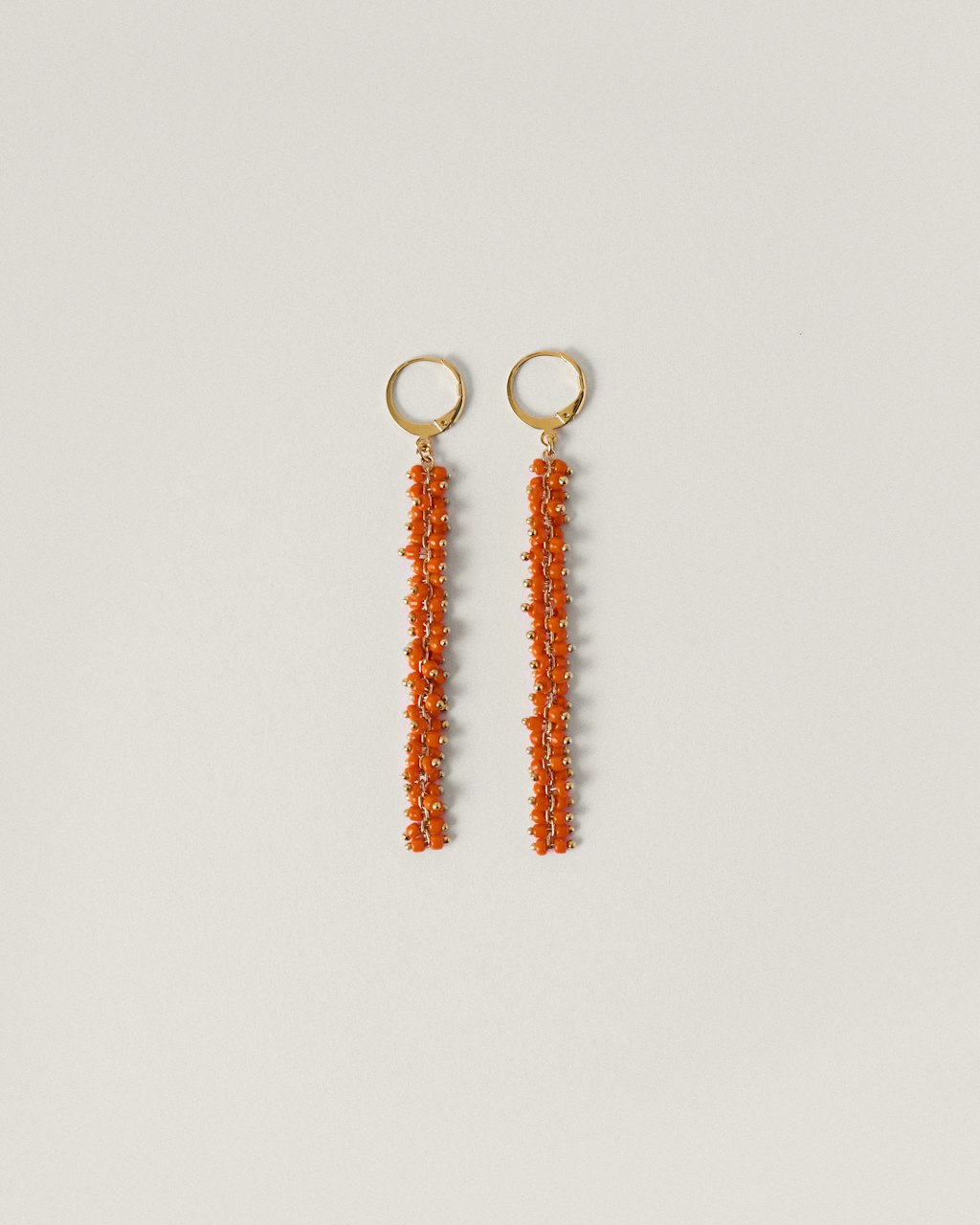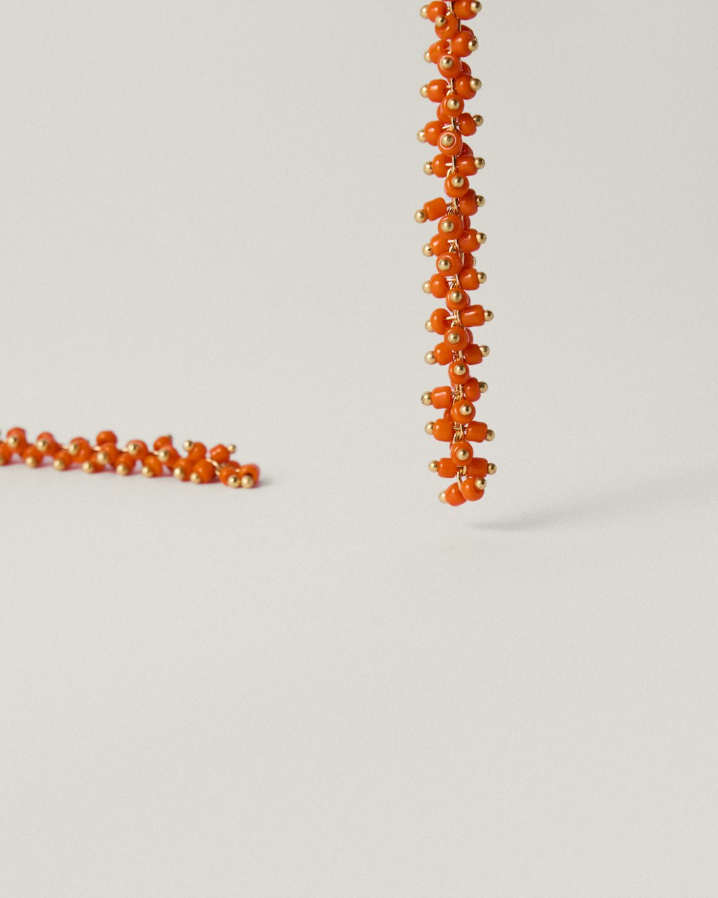 Pendientes largos con detalle de racimo de bolitas de colores, de peso muy ligero, colgado de la pieza, hecho de latón y chapado en 3 micras de oro de 18kt.