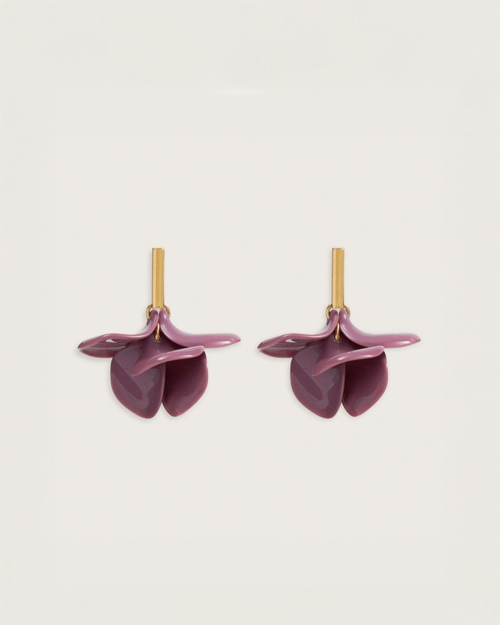 Pendientes de largo corto con coloridos motivos de pétalos hechos en metacrilato, de peso muy ligeros, colgados sobre un cierre con forma de barra hecho de latón y chapado en 3 micras en oro de 18kt.