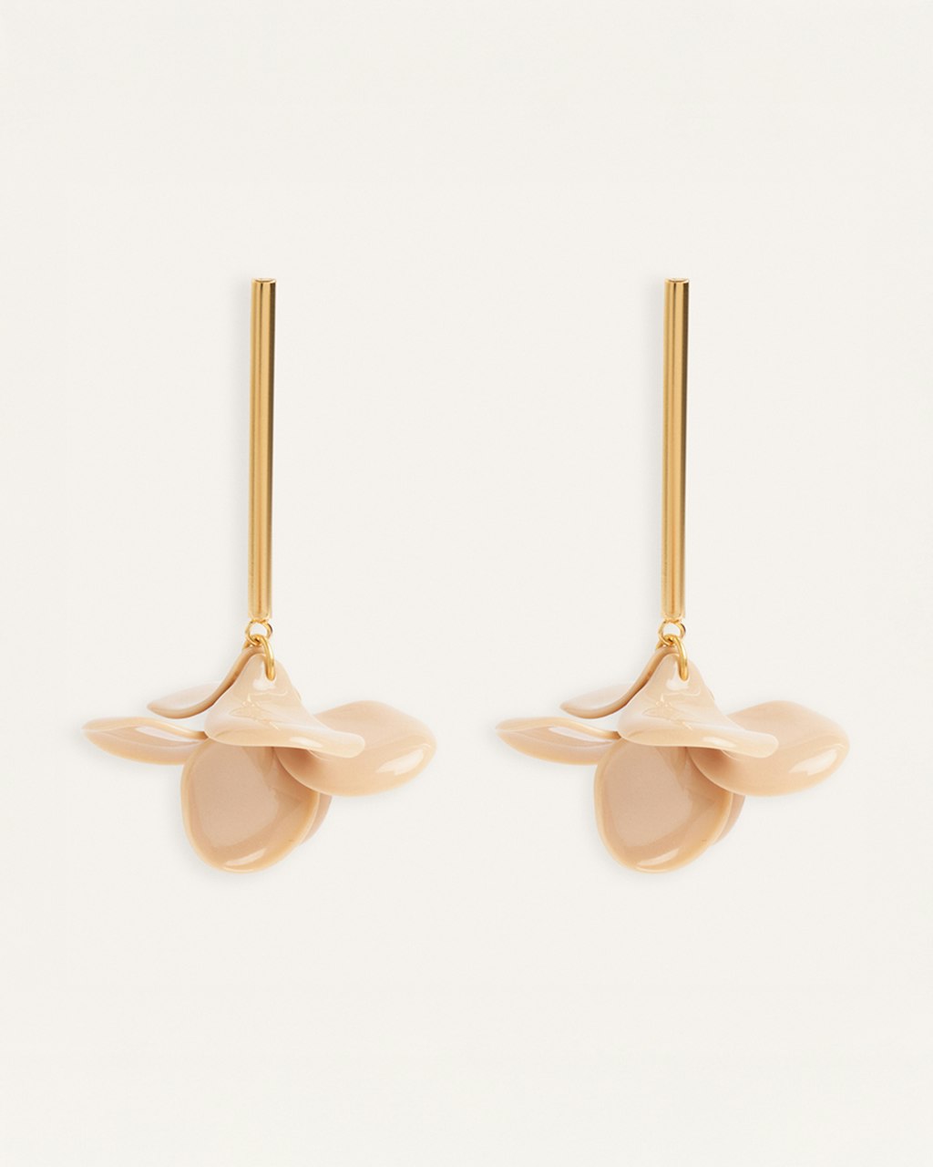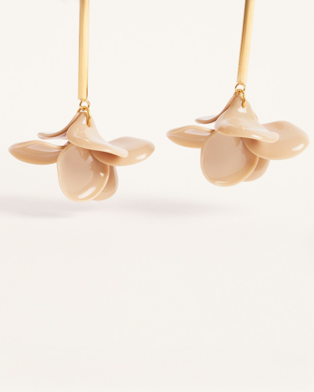 Pendientes largos con coloridos motivos de pétalos hechos en metacrilato, de peso muy ligeros, colgados sobre un cierre con forma de barra hecho de latón y chapado en 3 micras en oro de 18kt.