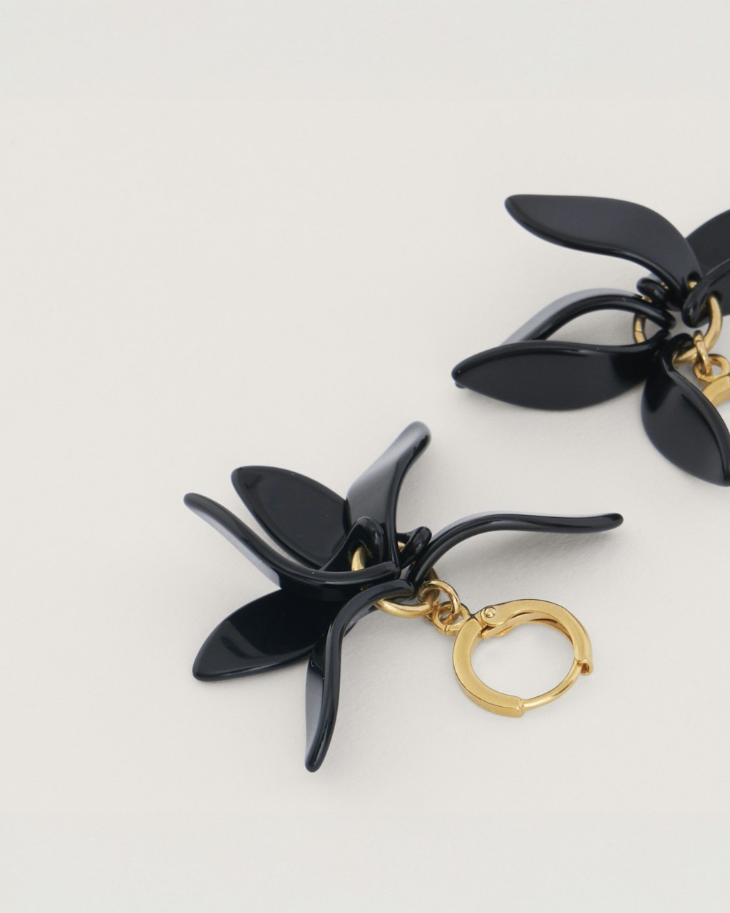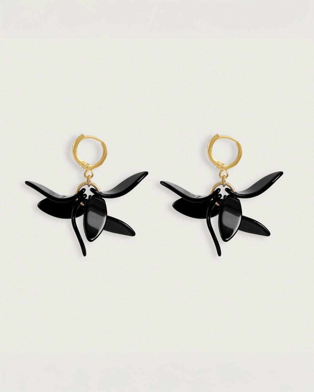 Pendientes medianos con coloridos motivos de pétalos finos hechos en metacrilato, de peso muy ligeros, colgados sobre un cierre de aro pequeño hecho de latón y chapado en 3 micras en oro de 18kt.