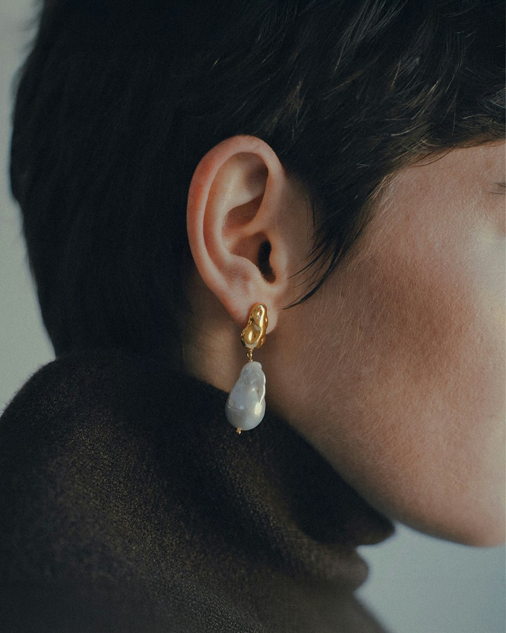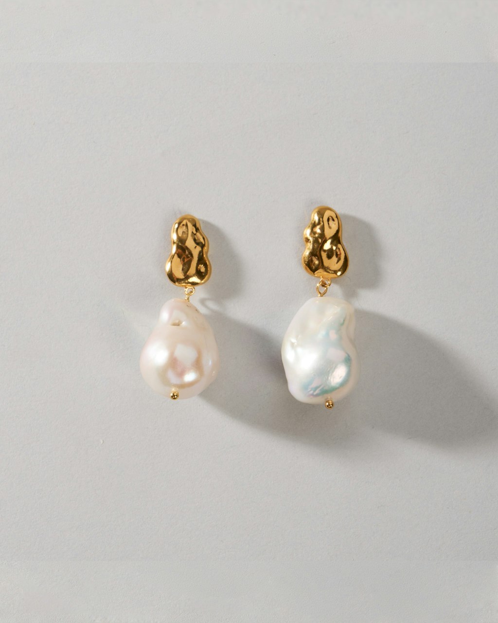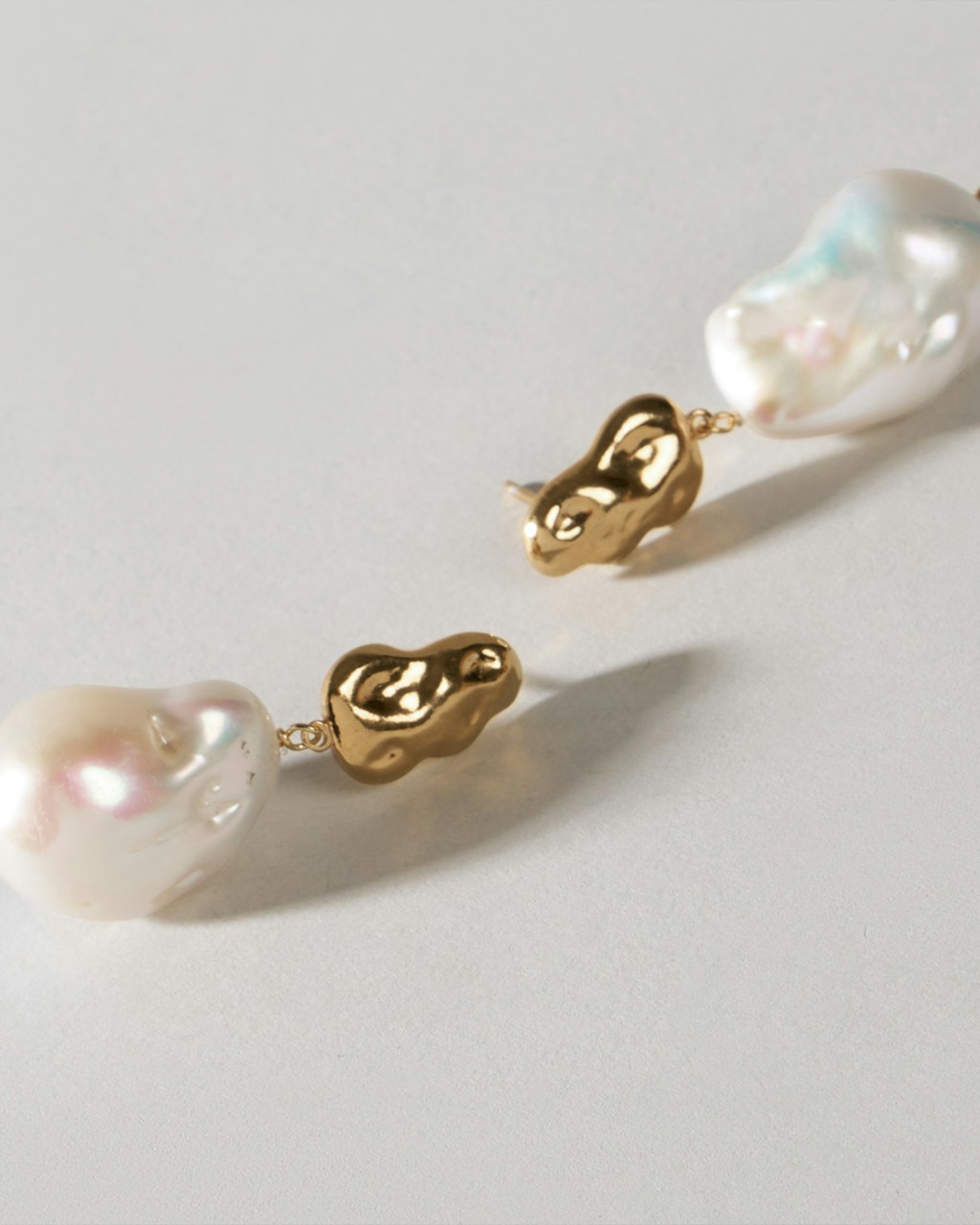 Pendientes con cierre de plata chapada en oro de 24kt y con dos perlas barrocas naturales grandes colgantes. El diseño del cierre está creado por el equipo de Malababa, imitando la textura irregular de las perlas.