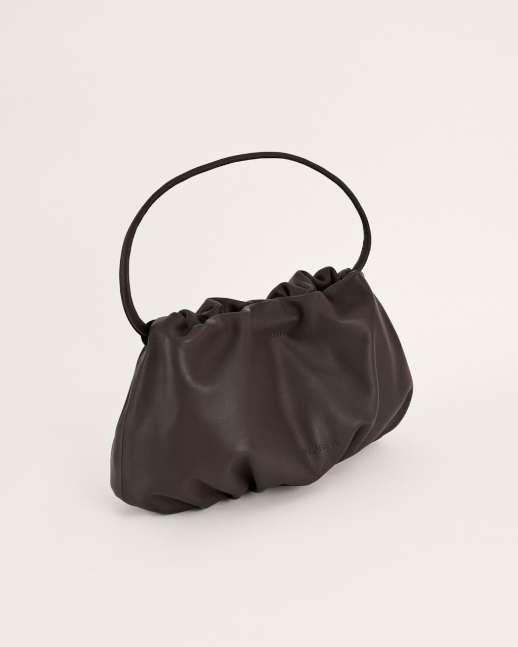 Bolso de hombro mediano realizado en piel de vacuno fruncido y con forro interior de algodón.