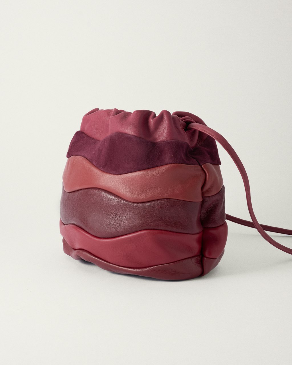 Bolso bandolera mediano, realizado con tiras irregulares de piel de cordero cosidas horizontalmente, tipo patchwork, creando un efecto de ondas.