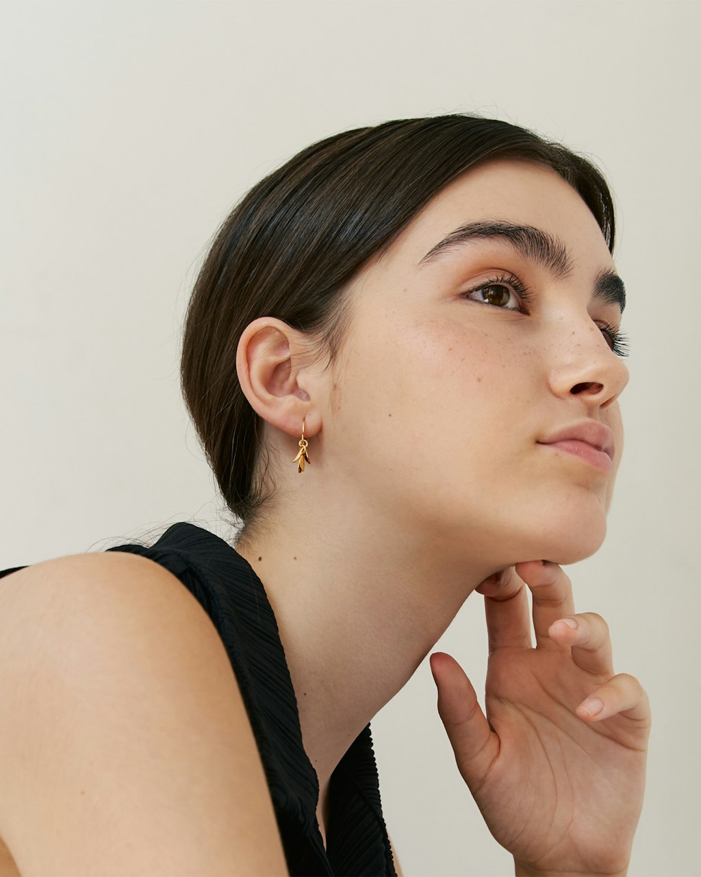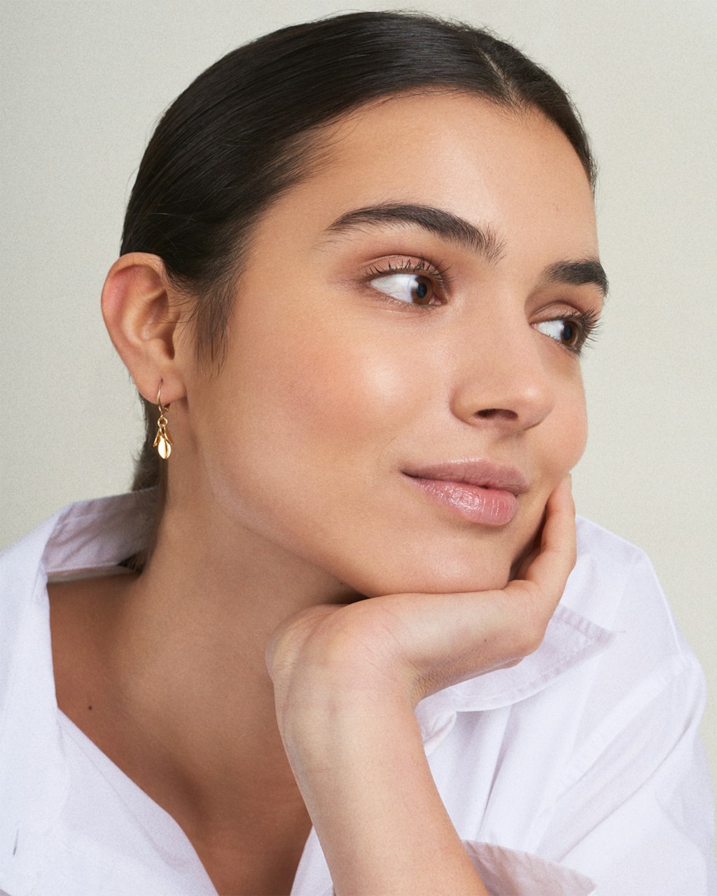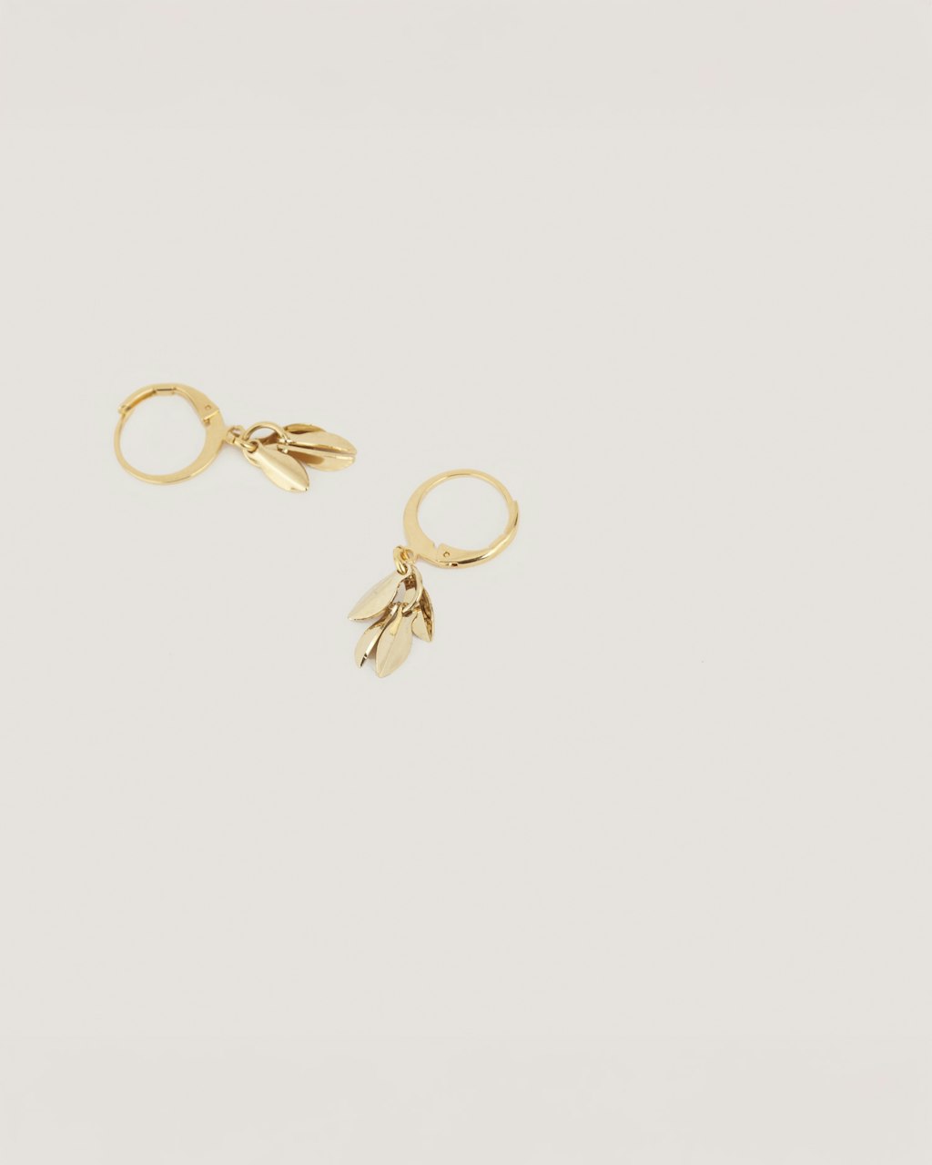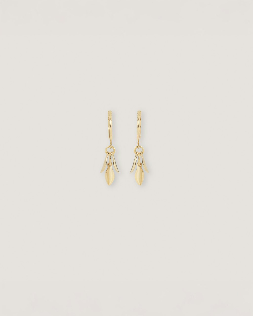Pendiente sencillo chapado en oro de 0,25 micras y níquel-free. Con detalles colgantes de piezas en forma de hoja.