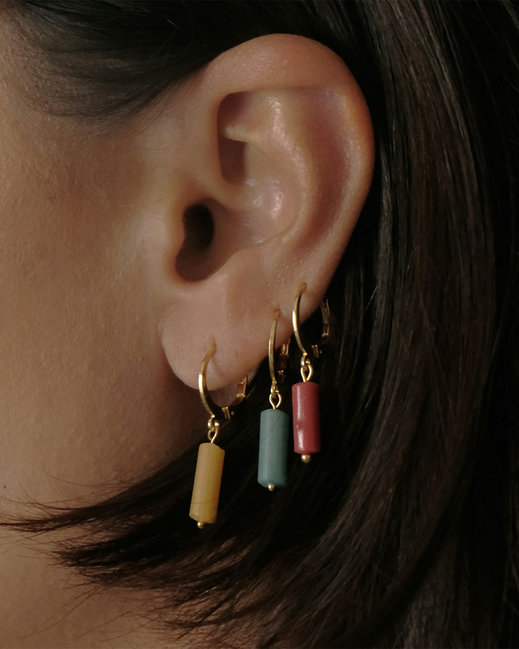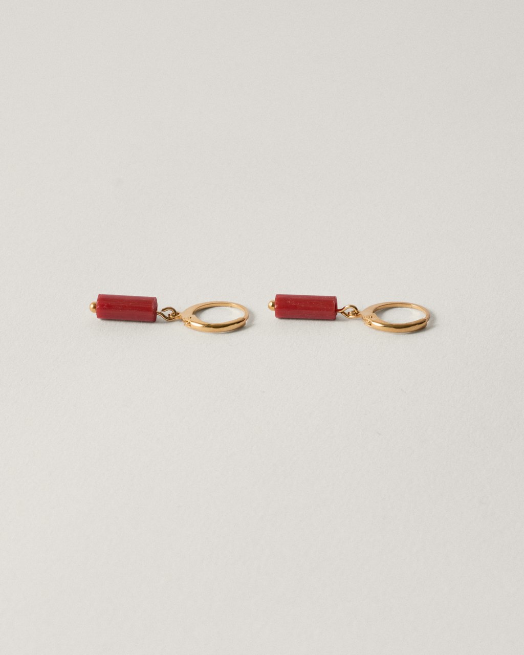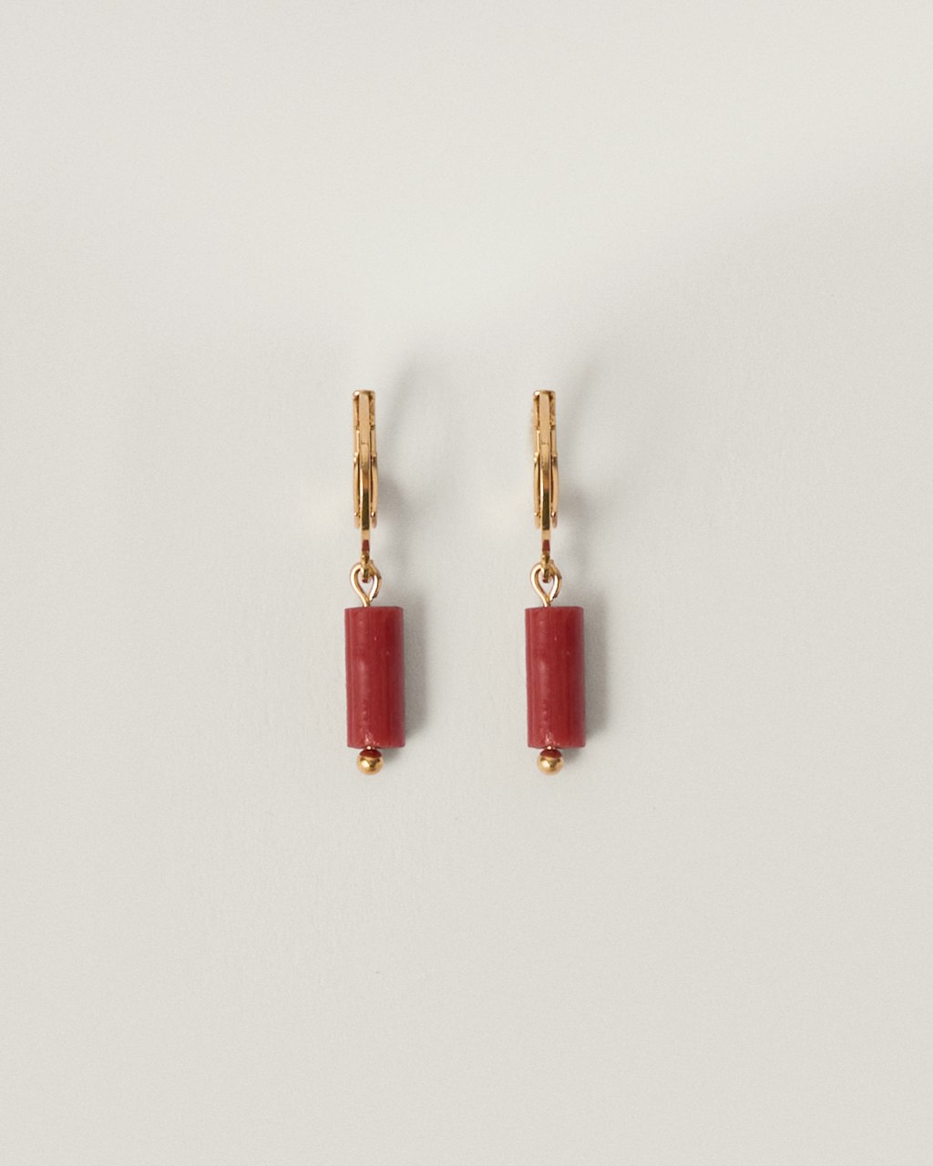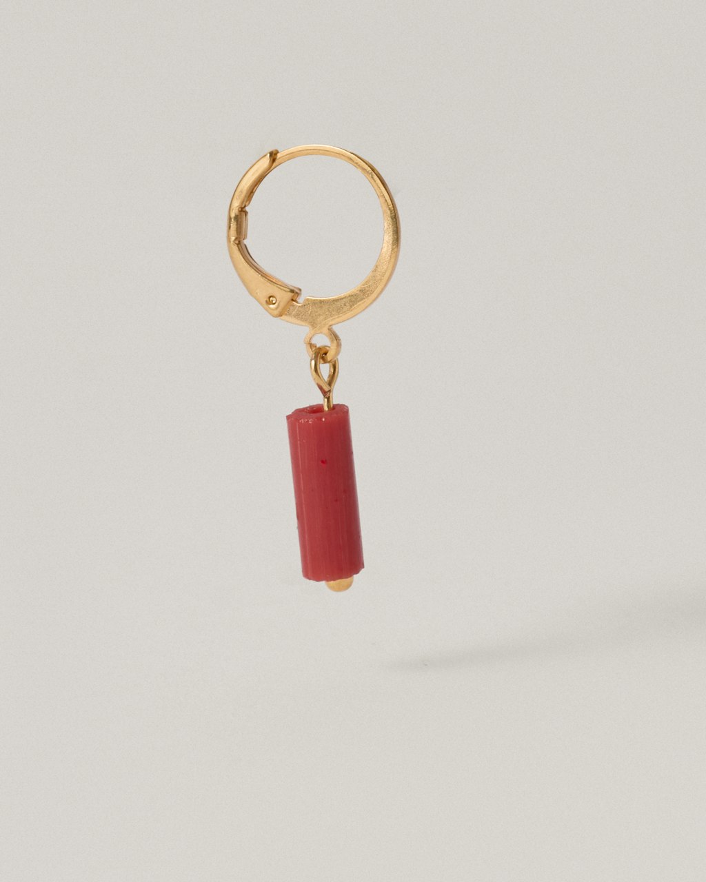 Pendientes pequeños con detalle de tubo fino de vidrio individual, disponible en distintos colores, de peso muy ligeros, colgados sobre un cierre de aro pequeño hecho de latón y chapado en 3 micras en oro de 18kt.