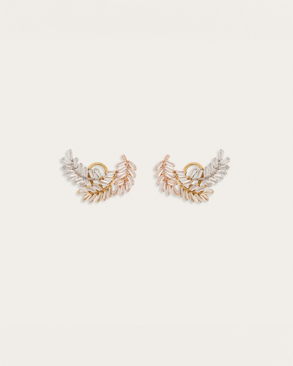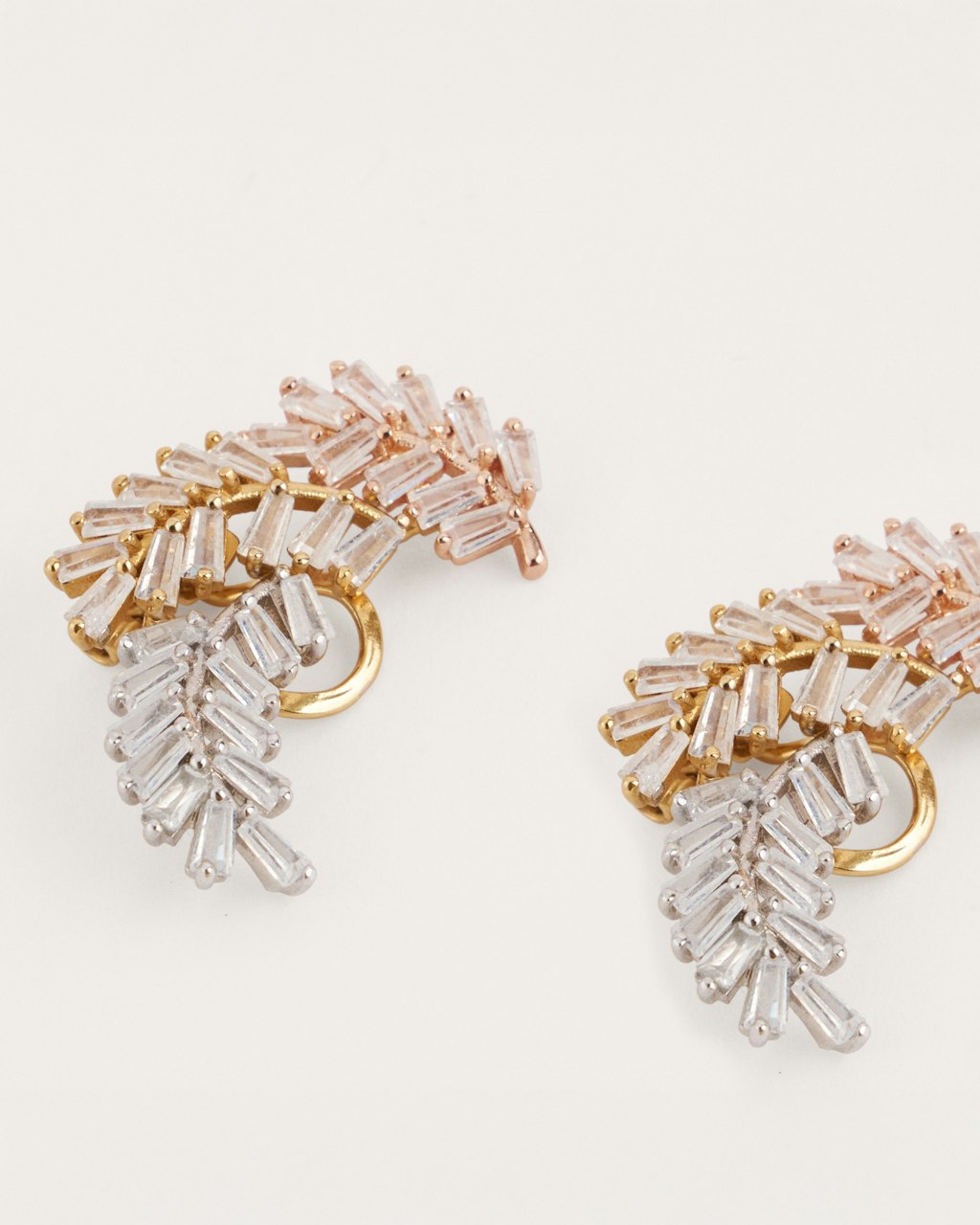 Pendientes elegantes con forma de ala e incrustaciones de circonitas. Están realizados en latón y chapados en 3 micras de oro de 18 kt y níquel-free en 3 tonos: oro rosa, amarillo y blanco.