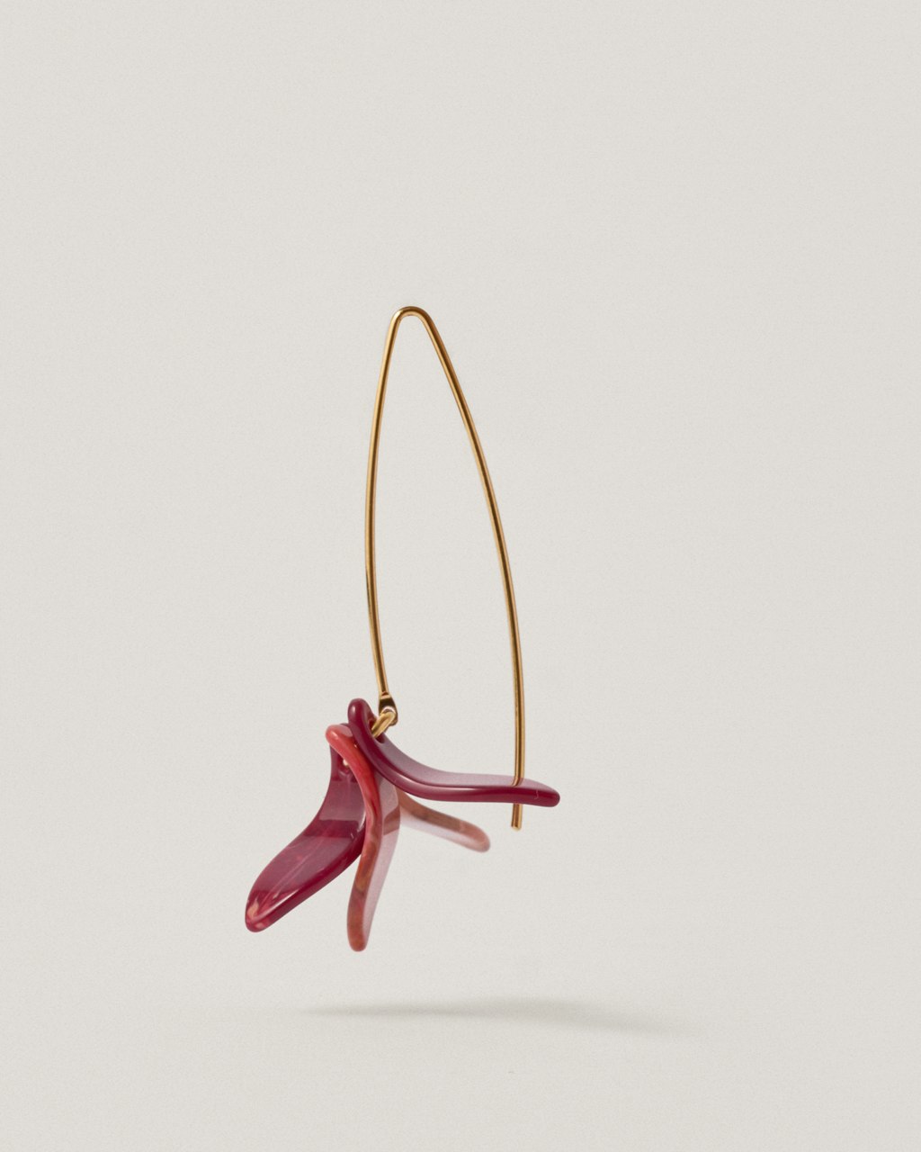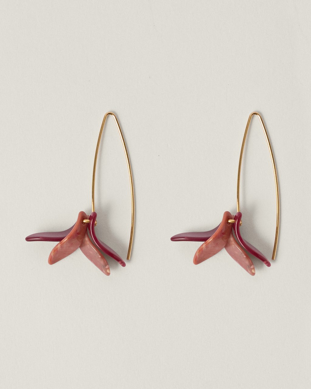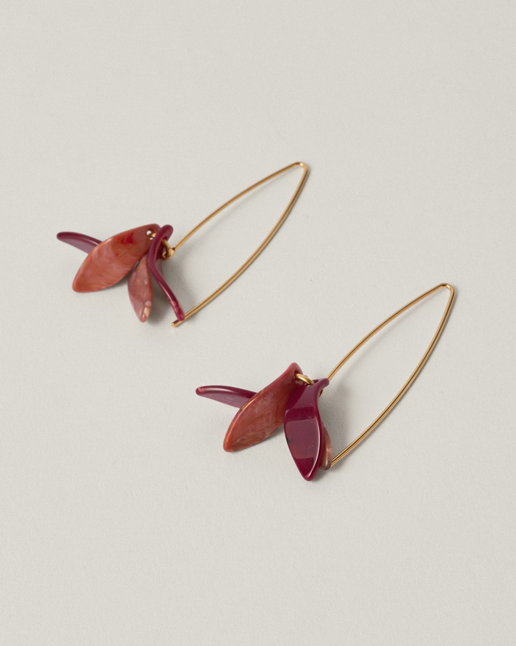 Colorful methacrylate petal motifs long-sized earrings, pending by a long brass thread, plated in 3 micron 18kt gold.