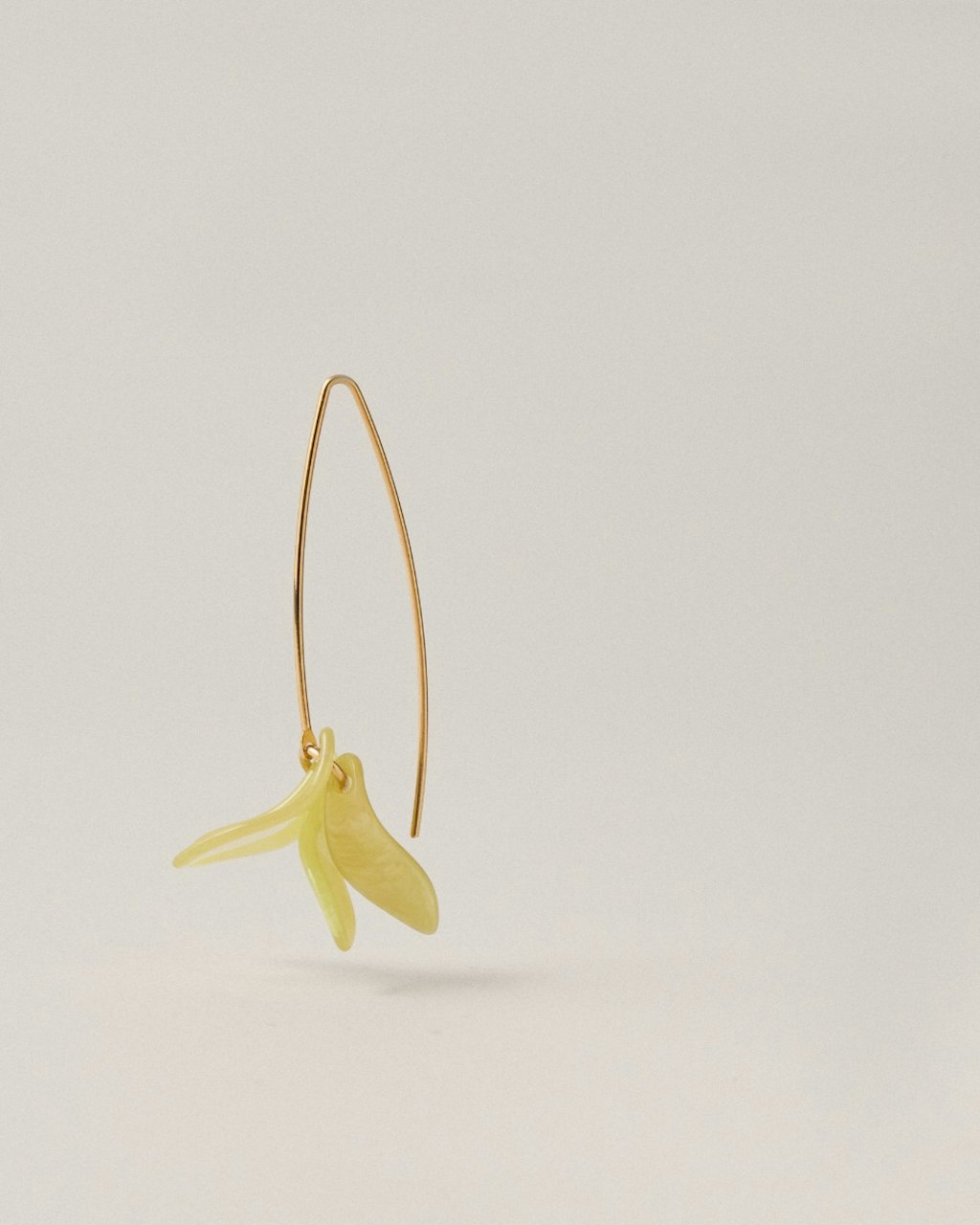 Colorful methacrylate petal motifs long-sized earrings, pending by a long brass thread, plated in 3 micron 18kt gold.