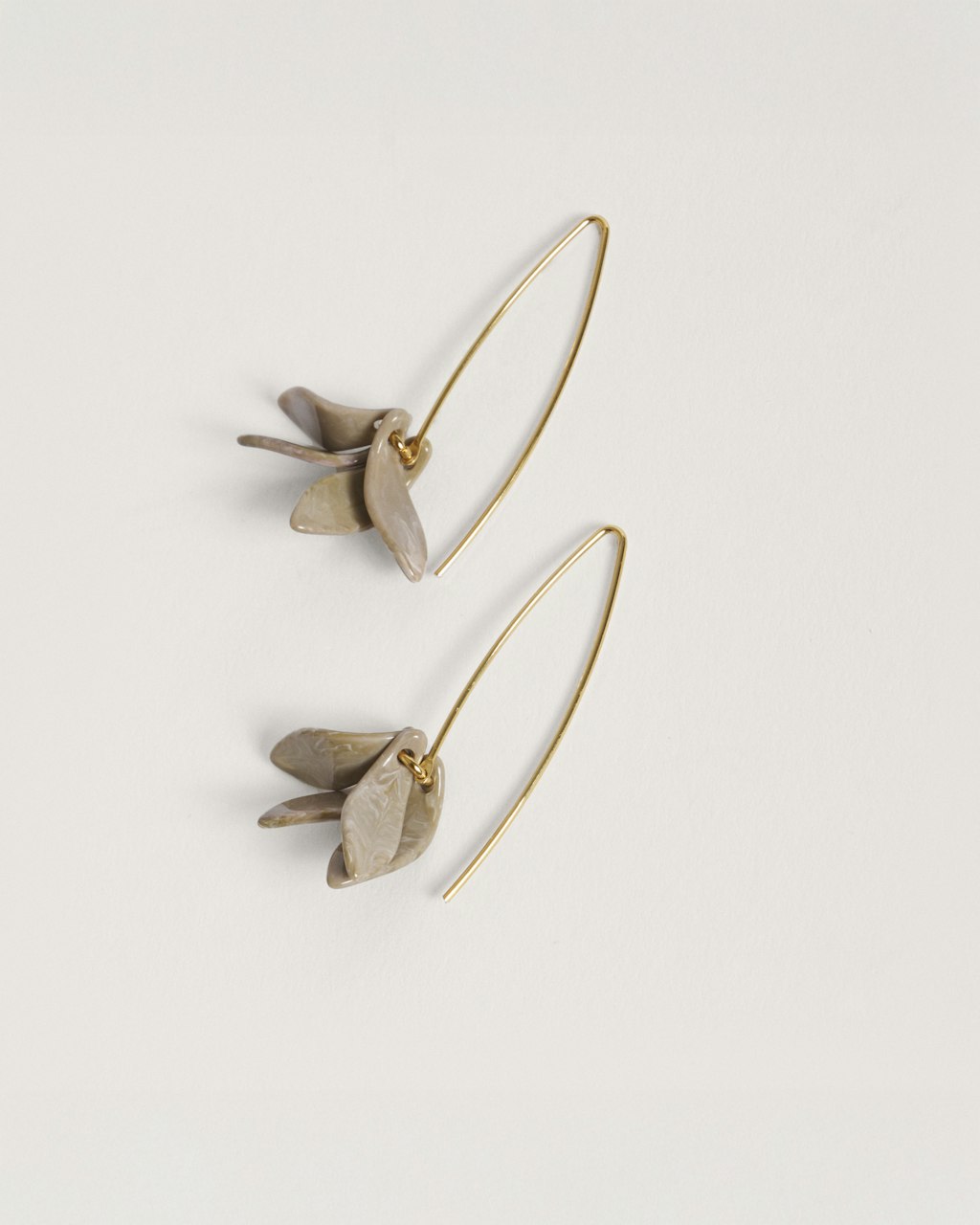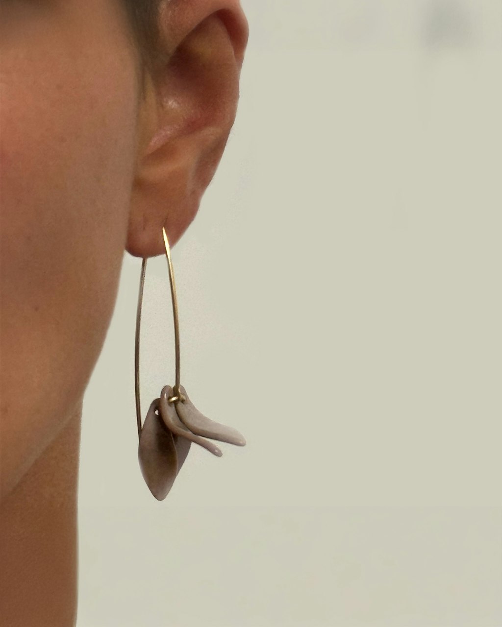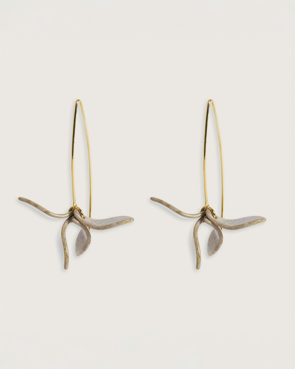 Colorful methacrylate petal motifs long-sized earrings, pending by a long brass thread, plated in 3 micron 18kt gold.
