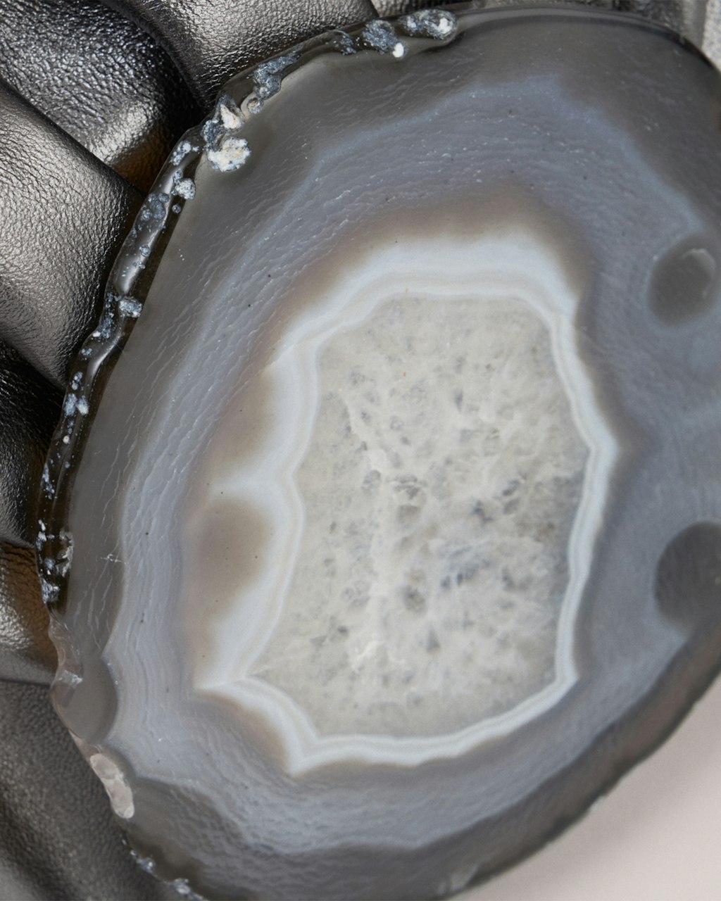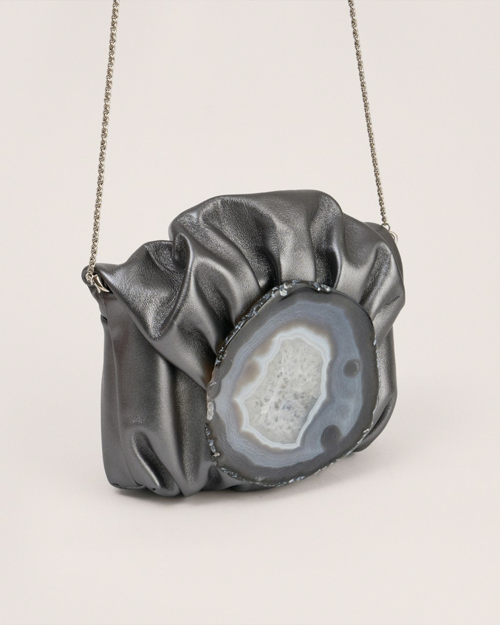 Medium-sized clutch with gathered structure made in Spanish entrefino lambskin, extremely soft and pleasant. Each bag features an authentic, natural and unique agate stone on its flap, selected by our design team, therefore each bag may differ from the images on our web.