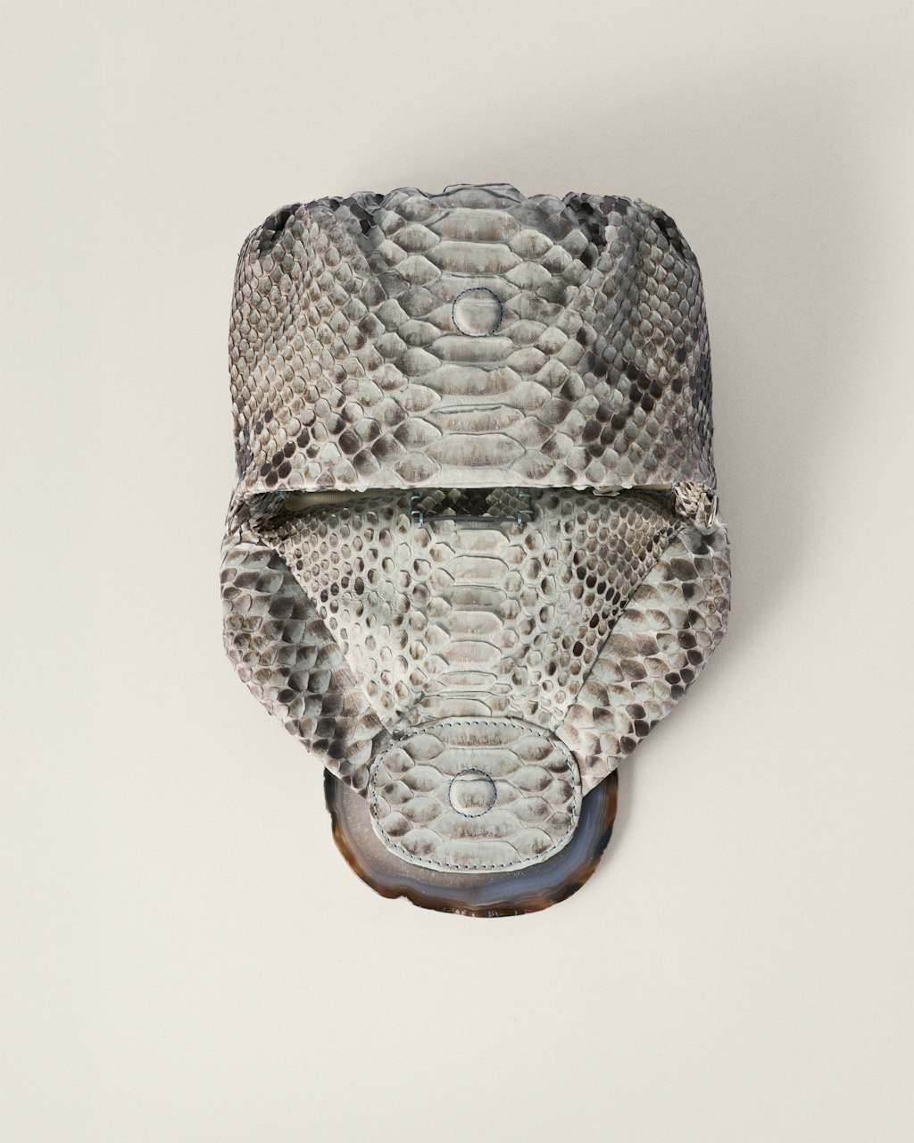 Medium-sized clutch with gathered structure made in hand painted python skin. Each bag features an authentic, natural and unique agate stone on its flap, selected by our design team, therefore each bag may differ from the images on our web.