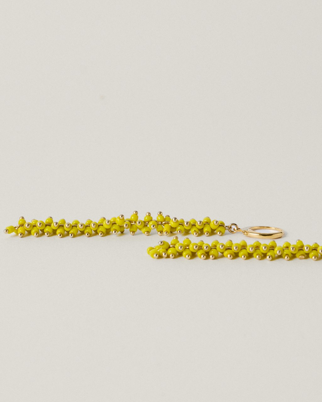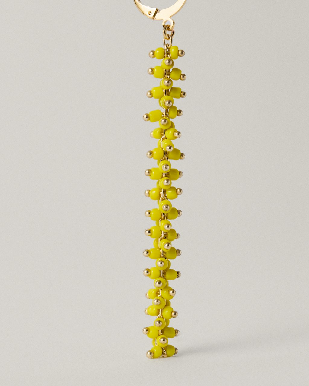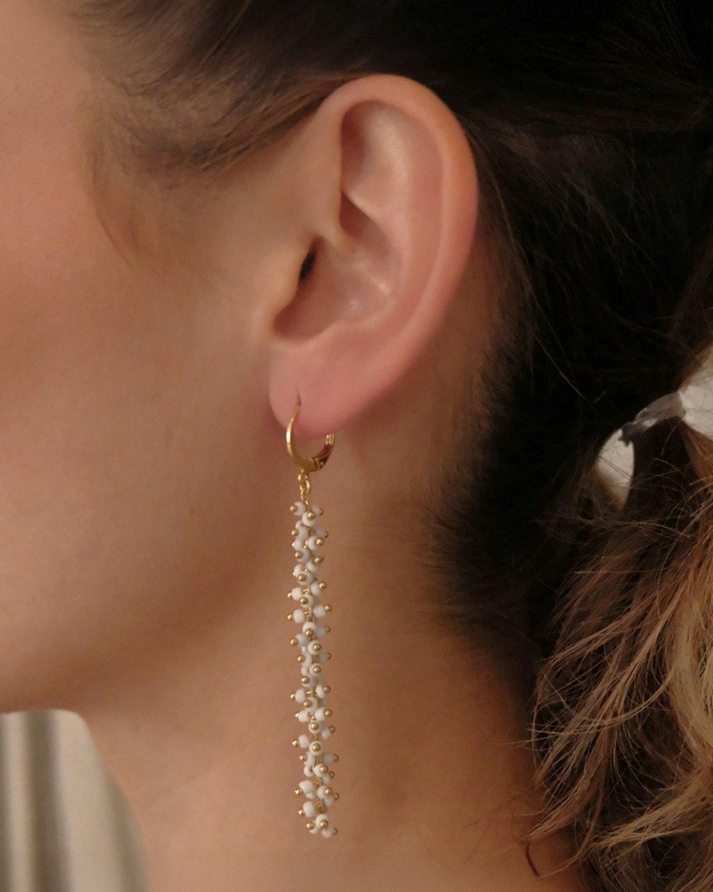 Long earing with hanging chain of tiny balls, made of brass and plated in 3 microns of 18kt gold