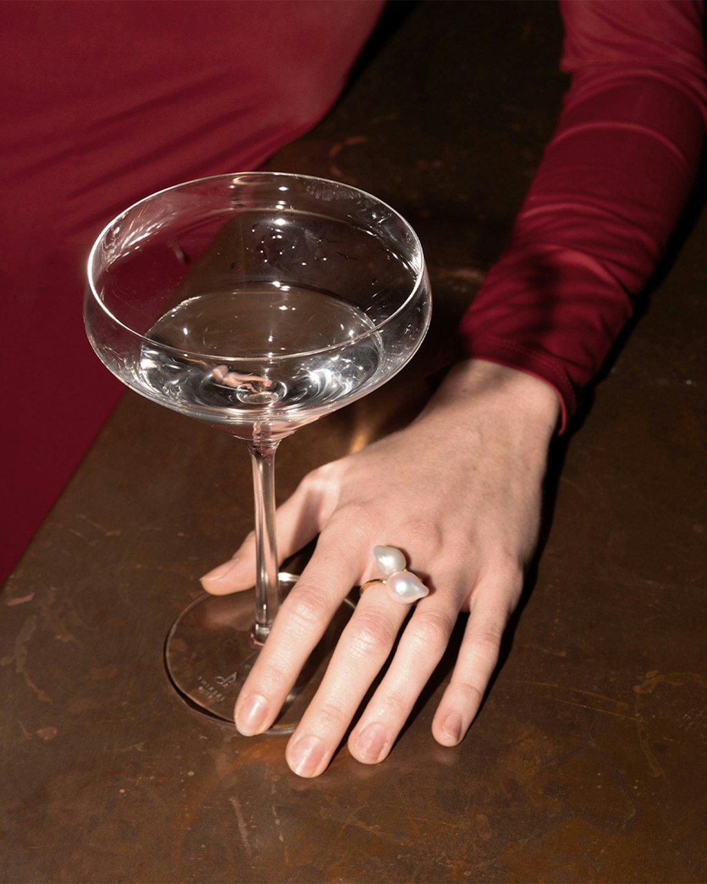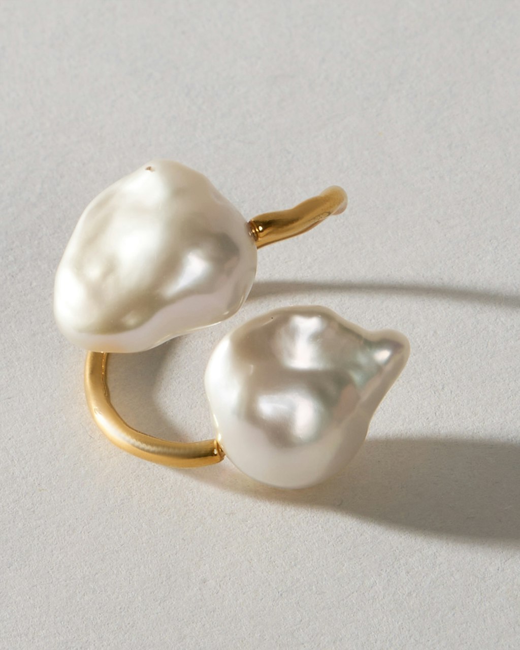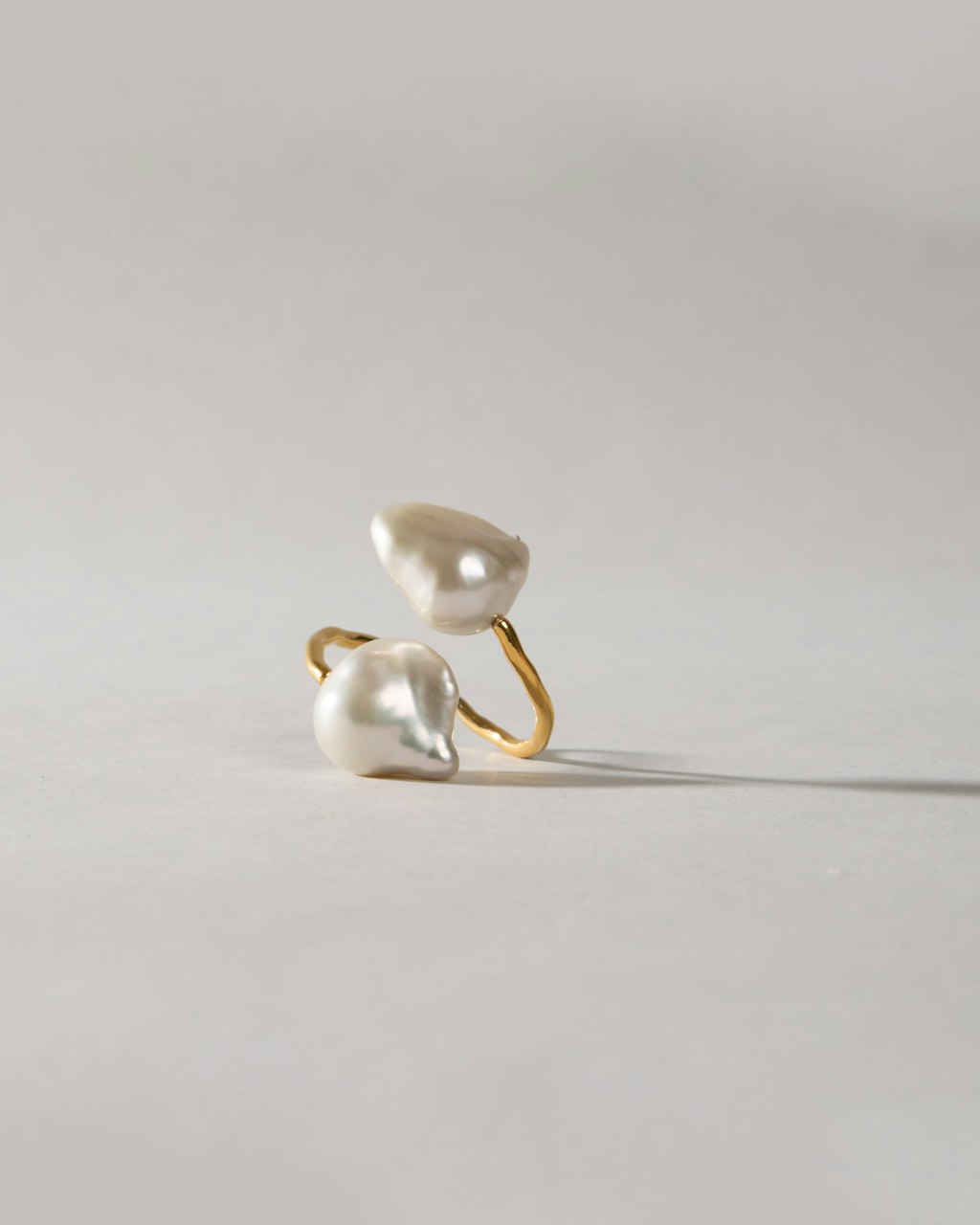 Sterling silver ring, plated in 2 micron of 24kt gold, with two natural baroque pearls.