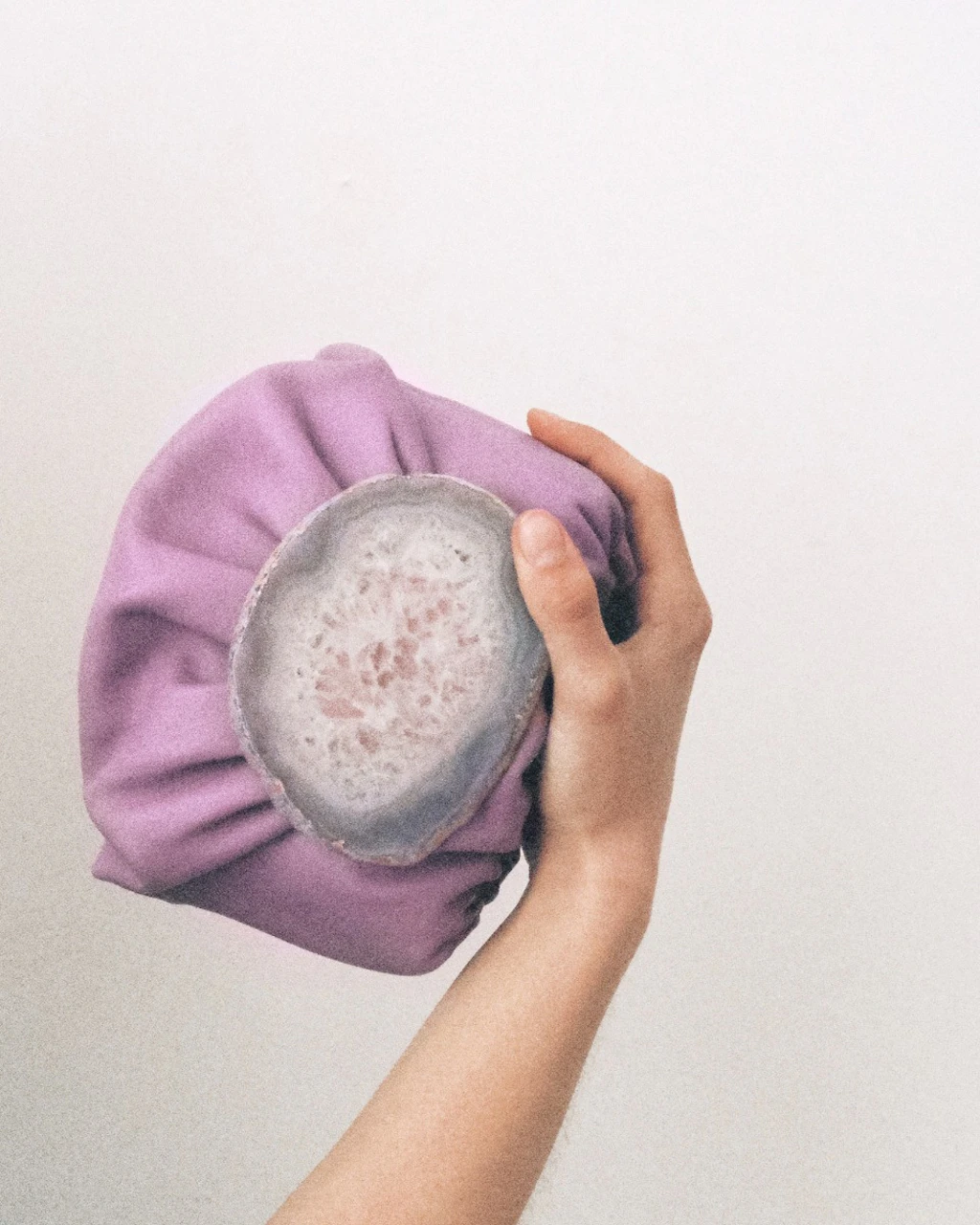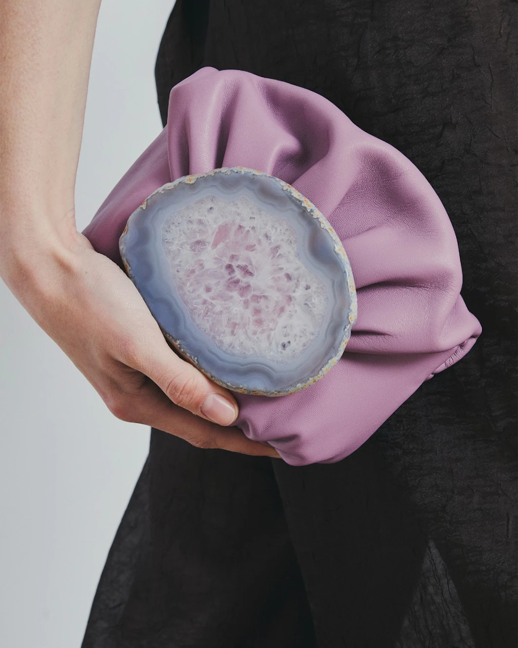 Medium-sized clutch with gathered structure made in Spanish entrefino lambskin, extremely soft and pleasant. Each bag features an authentic, natural and unique agate stone on its flap, selected by our design team, therefore each bag may differ from the images on our web.