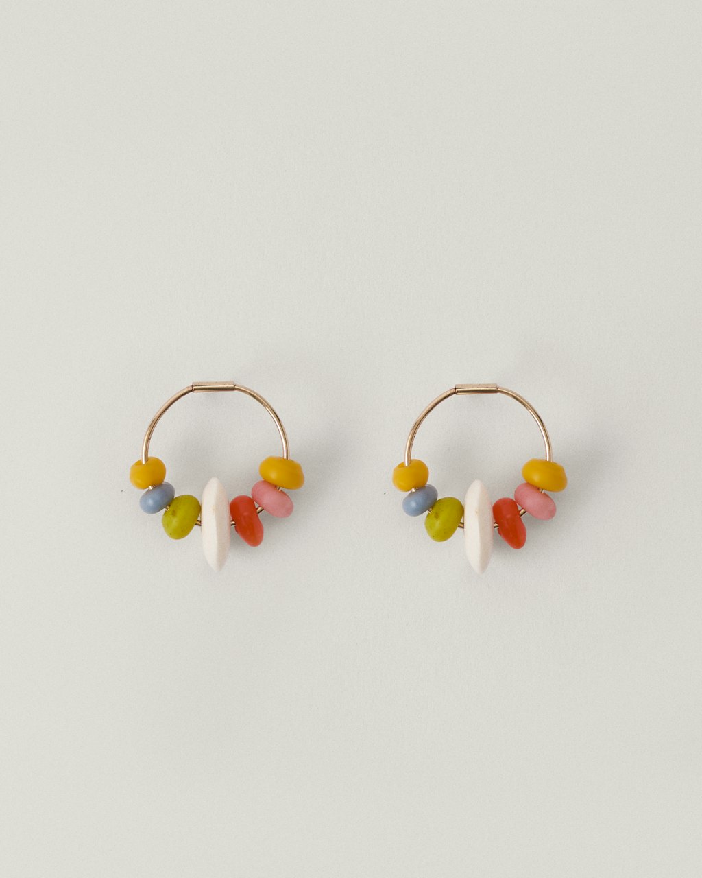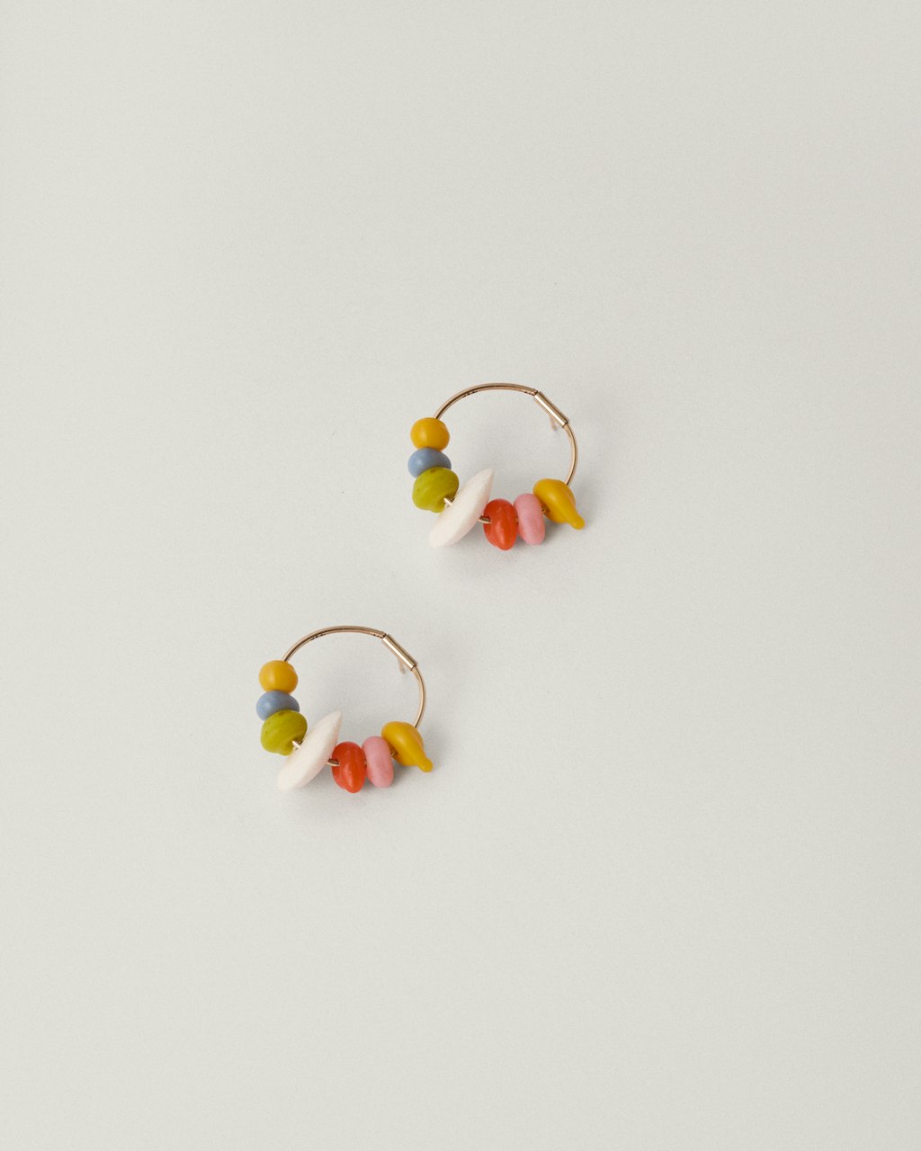 Colorful methacrylate petal motifs medium-sized earrings, pending by a medium size hoop earring made of brass, plated in 3 micron 18kt gold.