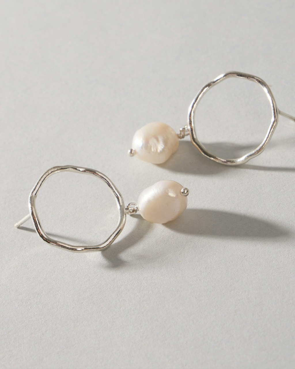 Earrings made of sterling silver and two medium-sized natural baroque pearls hanging. The frontal hoop design is created by Malababa's design team.