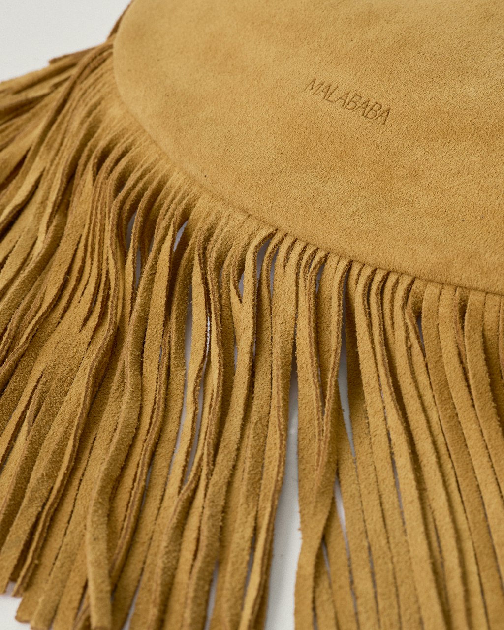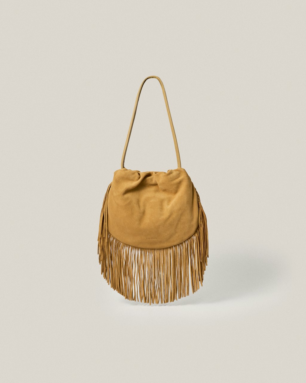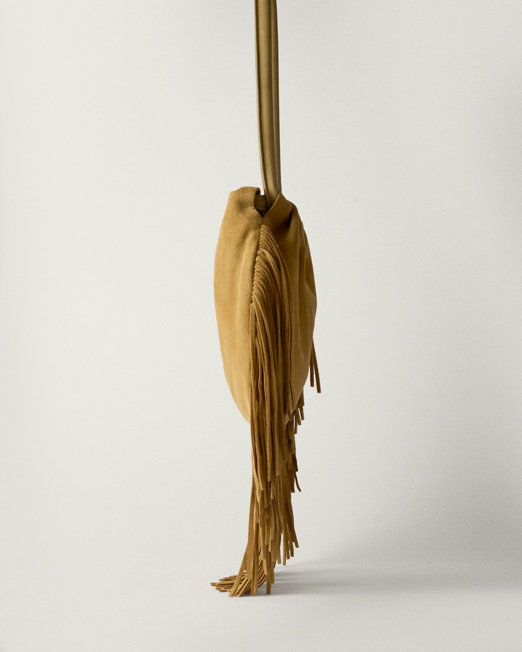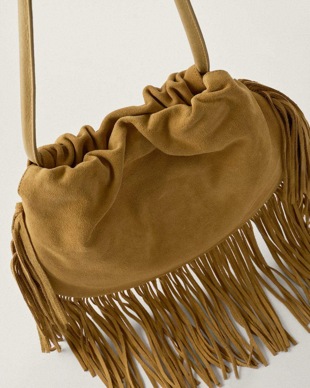 Medium size shoulder bag, made of suede, with fringes.
