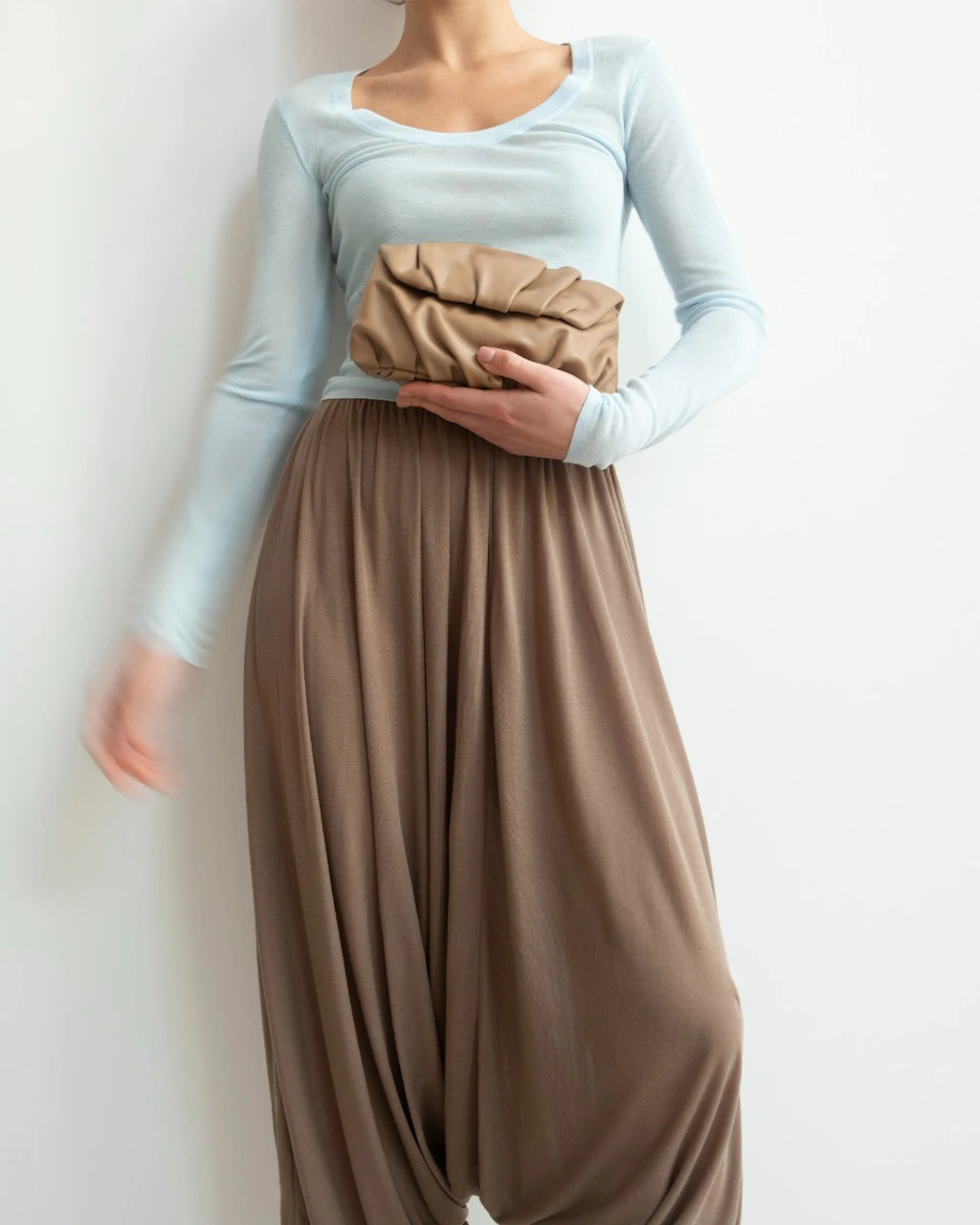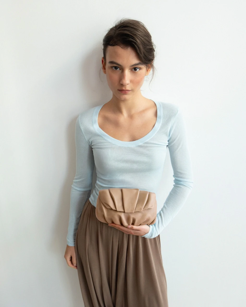 Medium-sized clutch with gathered structure made in lambskin leather, extremely soft and pleasant.