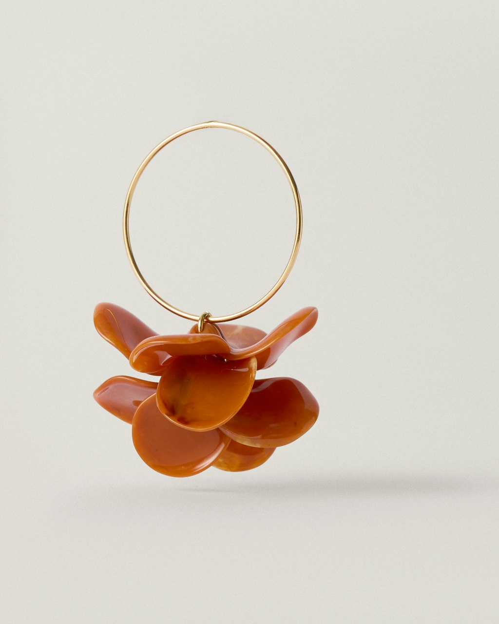 Motivos de pétalos de metacrilato muy ligeros colgados sobre aro de latón grande chapado en oro con cierre incorporado.