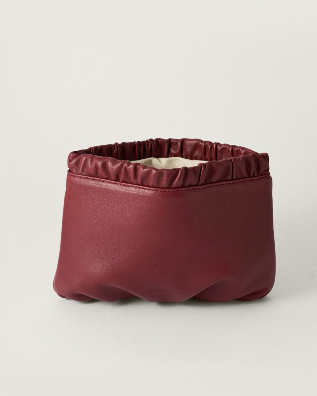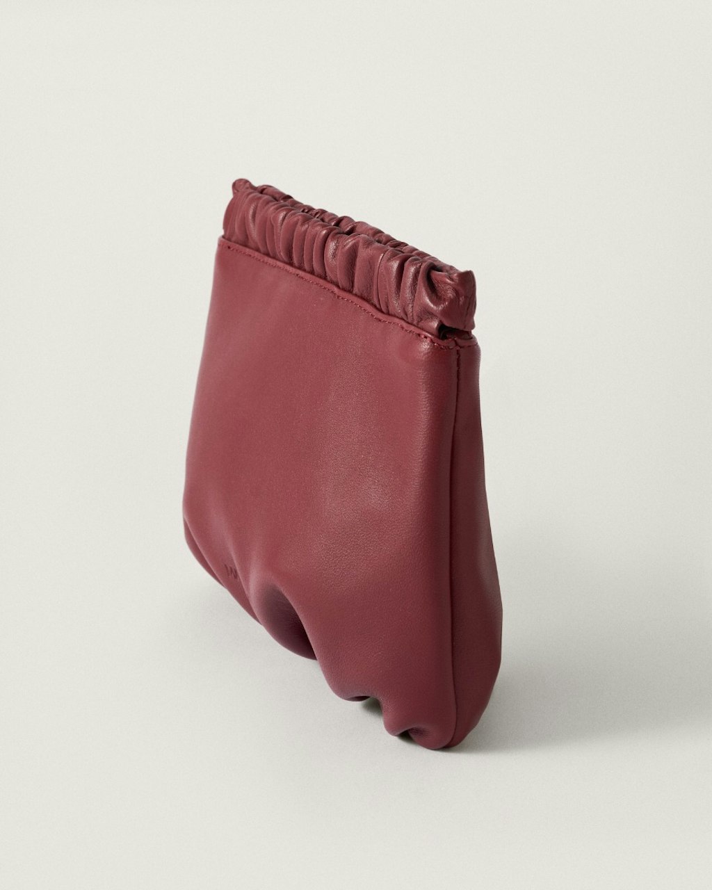 Medium size clutch with gathered details. Handcrafted from exceptionally soft lamb leather and available in a wide range of colors. It can be carried by hand as a clutch or worn over the shoulder with its chain strap.