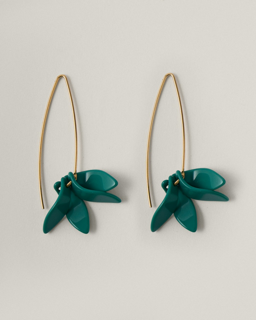 Colorful methacrylate petal motifs long-sized earrings, pending by a long brass thread, plated in 3 micron 18kt gold.