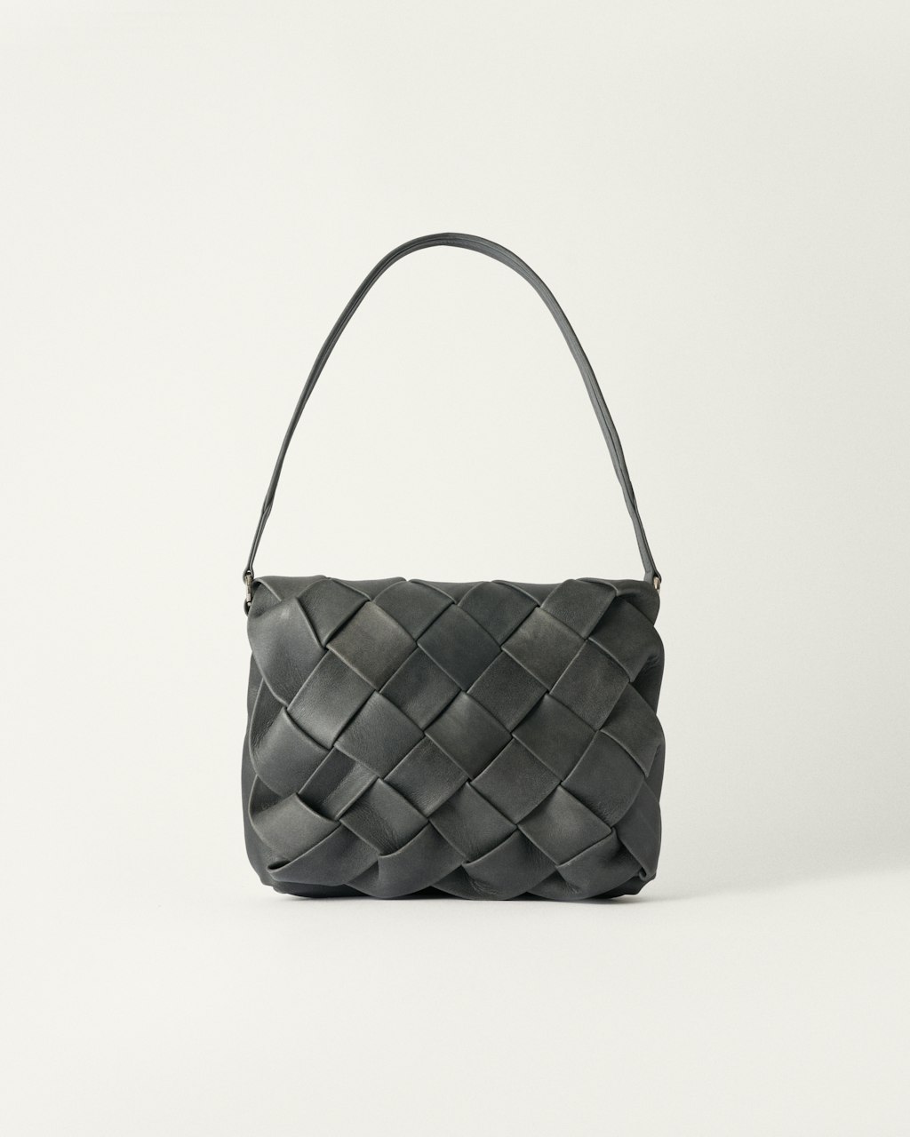 Medium squared bag, practical and functional, manufactured in soft cowhide leather with cushioned shoulder strap made of cowhide leather as well. The panel of braided leather straps is impeccably hand-braided by our leather artisans. The shoulder strap is detachable so the bag can be carried as well as a clutch. Zip closure and inside pocket.