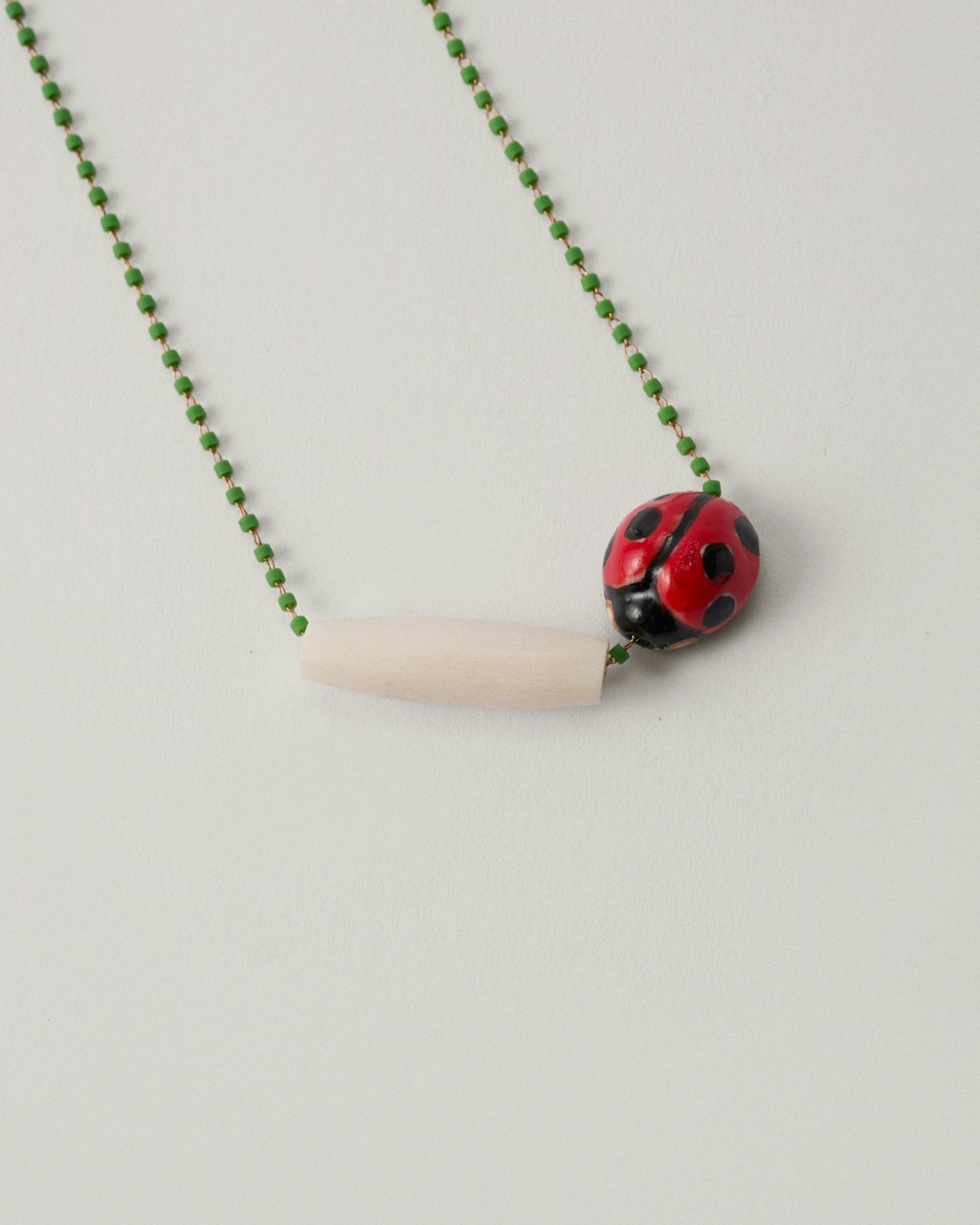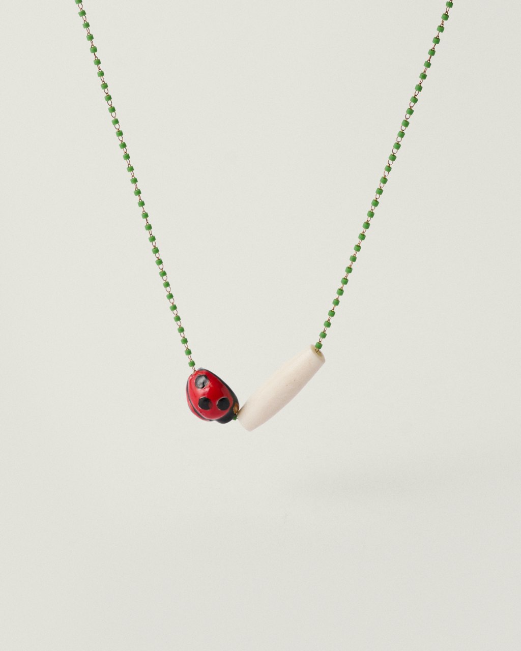 Short necklace made with a delicate Miyuki bead chain, known for its precision and lightness. The piece is completed with a central ladybug-shaped ceramic element and a bone detail, adding a distinctive and luminous touch to the design. A playful necklace, perfect to wear on its own or layered with other necklaces, bringing a unique accent to any look. Handmade in our Madrid workshop.