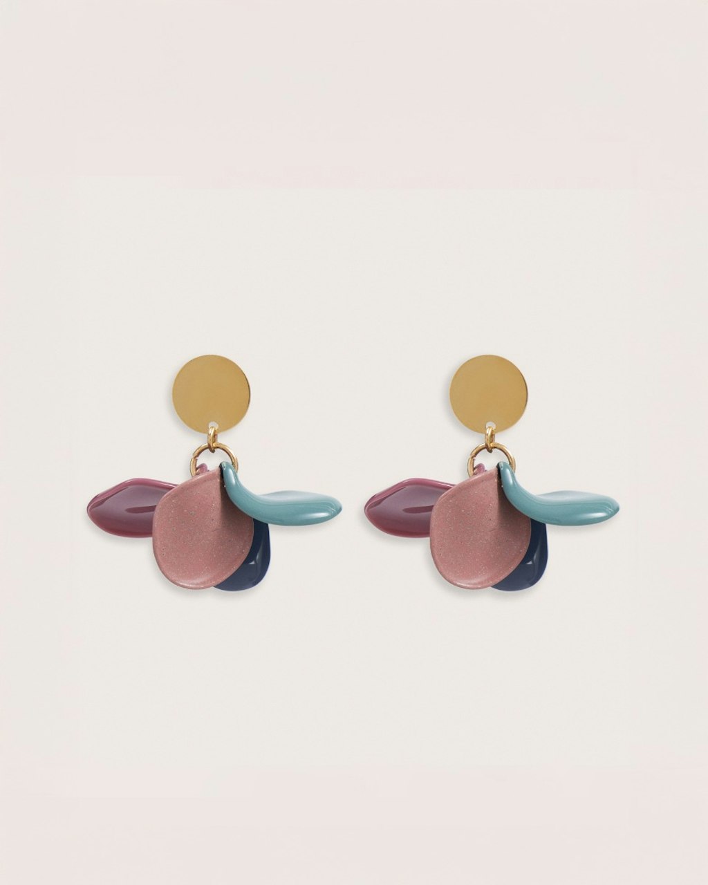 Methacrylate petal motifs. Very light weighted. Hanged on gold plated brass circular piece. Hoop with clousure.