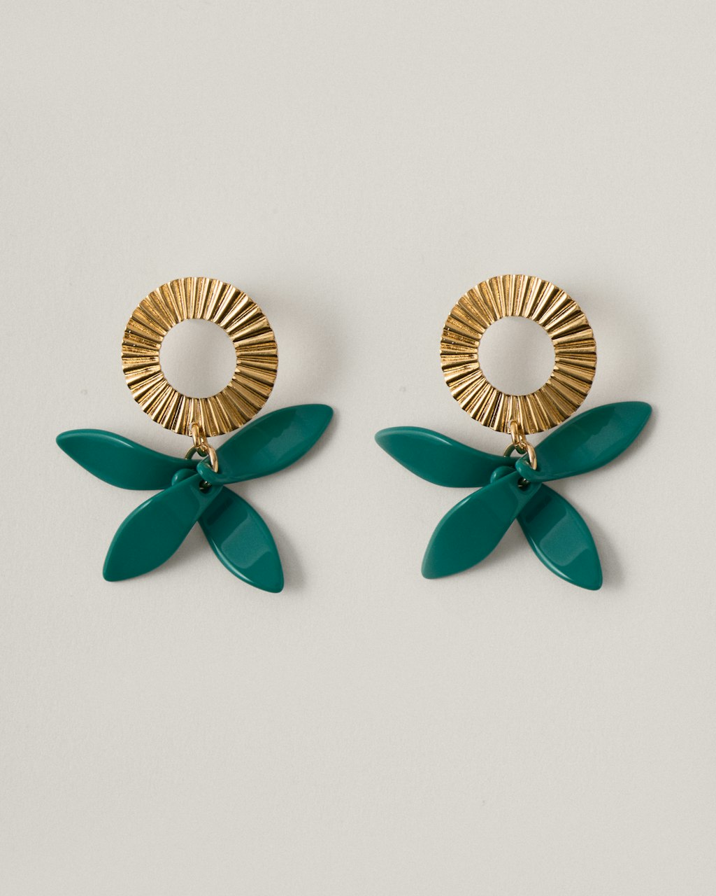 Medium sized earrings with very light methacrylate petal motifs hanging on a striking sun-like shaped closure, made of 2 microns of 18kt gold-plated brass with a nut closure.