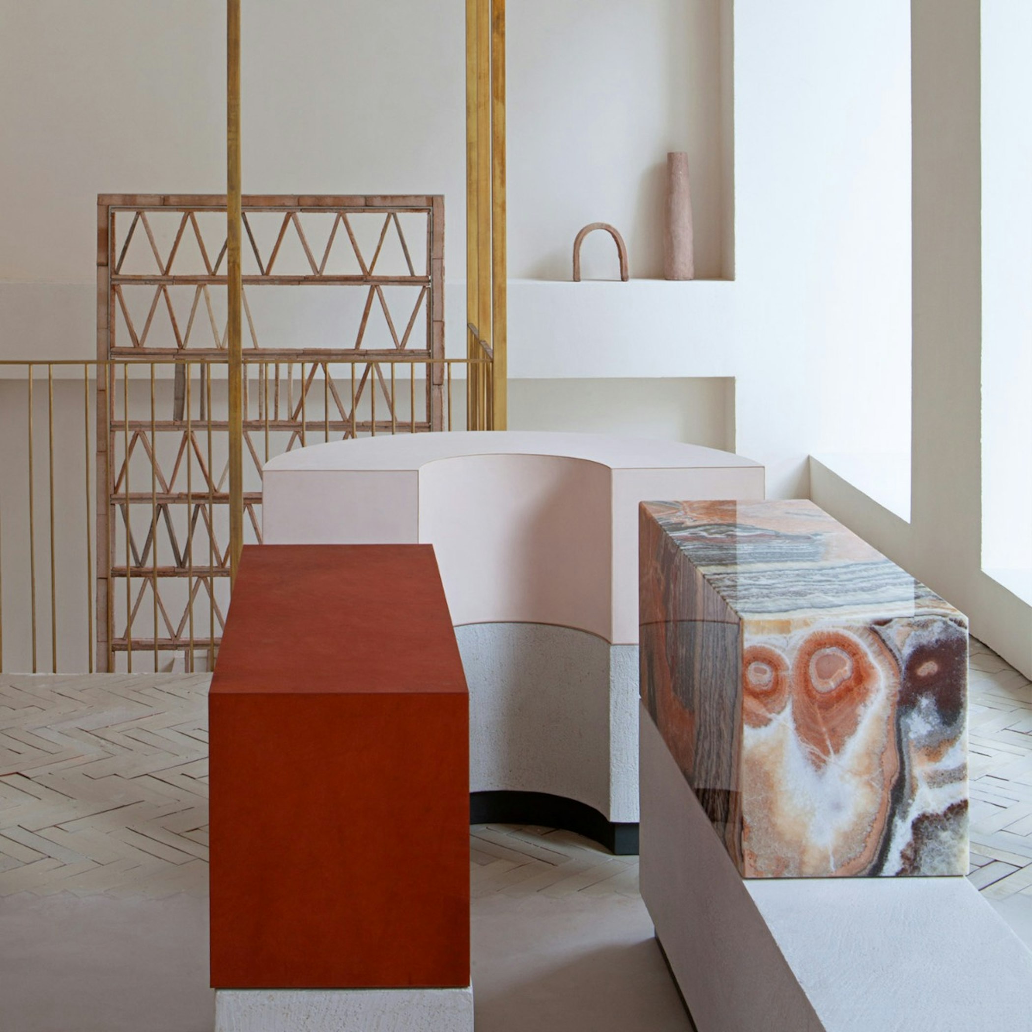 Mobile modular furniture can combine and change layouts as needed. They have been manufactured with limestone from Seville, aged brass and beautiful blocks of moss agate gemstone. Some are upholstered with the same leather we use for our collections.